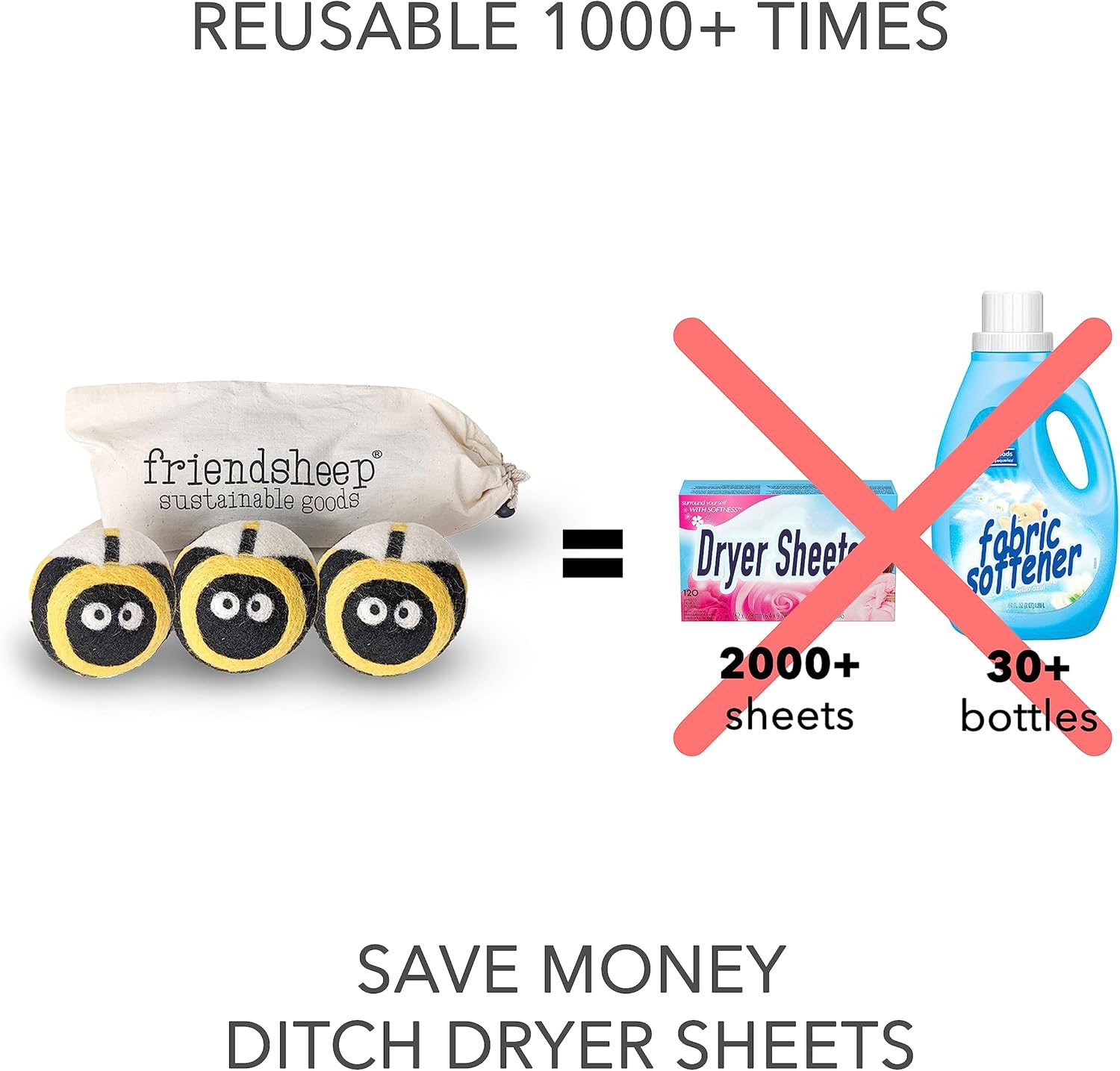 Friendsheep Wool Dryer Balls, Organic Reusable Fabric Softener Alternative for Laundry, Handmade, Fair Trade, Hypoallergenic, Eco-Friendly, Plastic-Free (3 Pack XL – Honey Bee)
