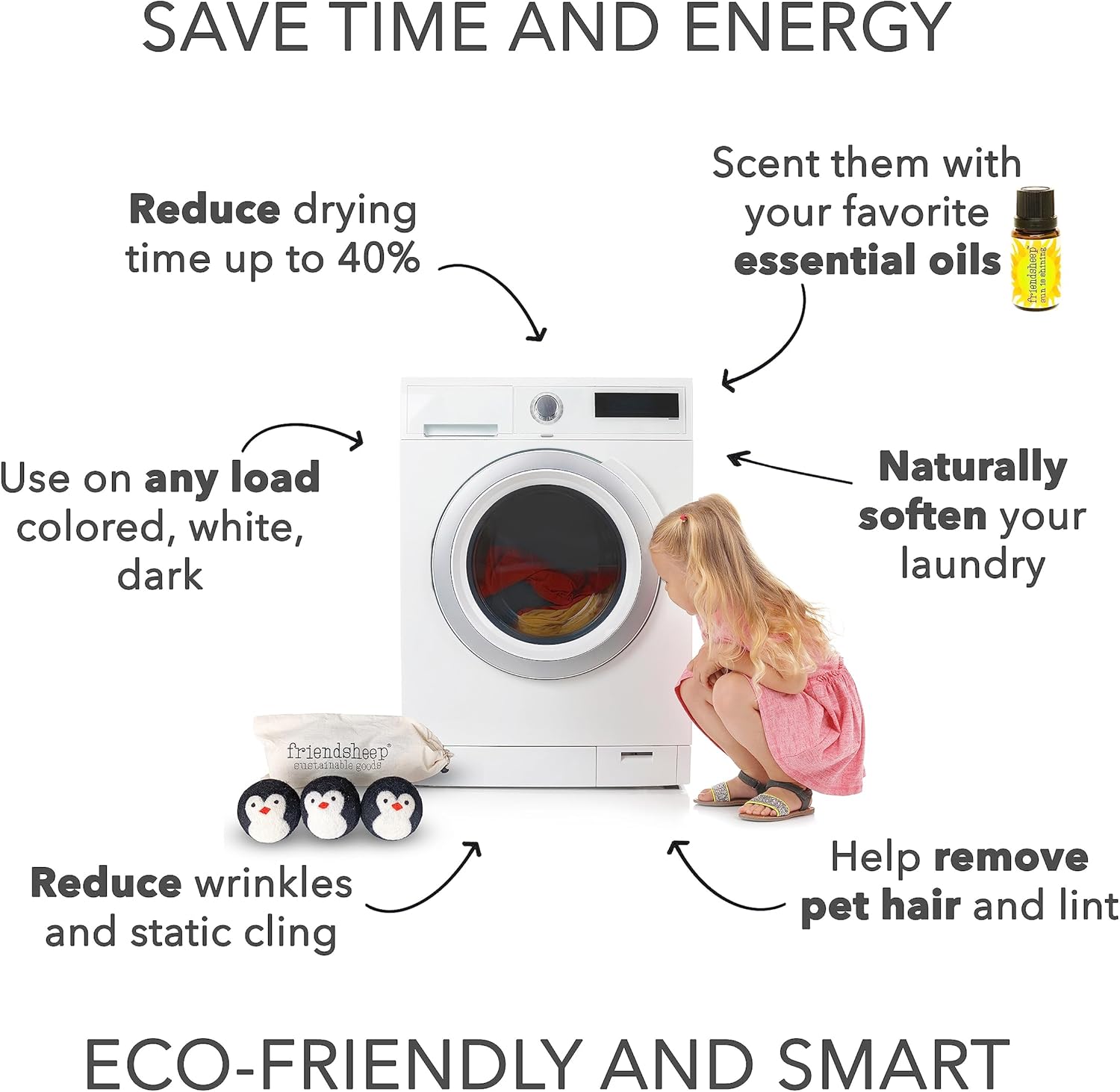Friendsheep Wool Dryer Balls, Organic Reusable Fabric Softener Alternative for Laundry, Handmade, Fair Trade, Hypoallergenic, Eco-Friendly, Plastic-Free (3 Pack XL – Penguin)