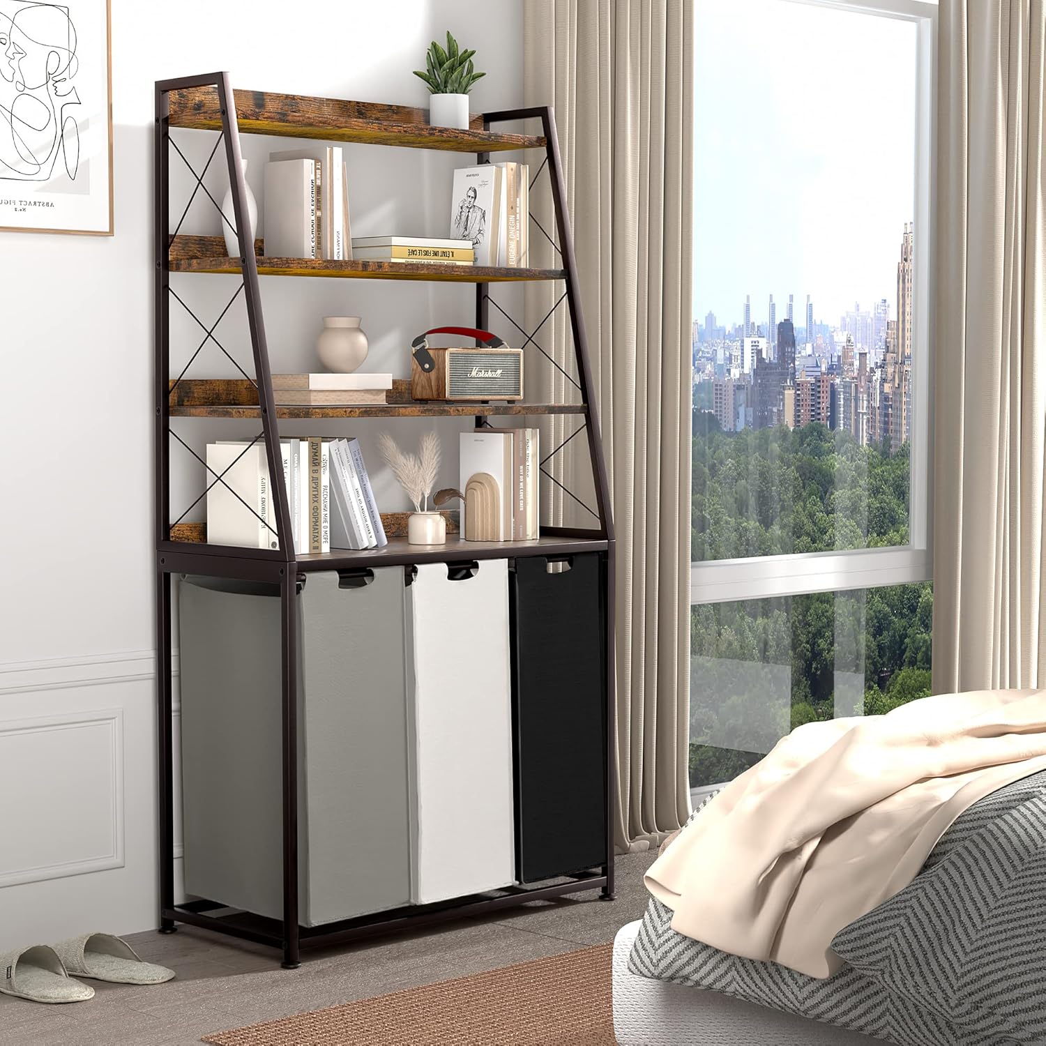 Laundry Basket, 3 Section Laundry Hamper with 4 Tiers Shelf, Pull-Out and Removable Laundry Bags, Large 3 x 15.87 Gallons, for Laundry Room Bathroom Rustic Brown PF05XLN