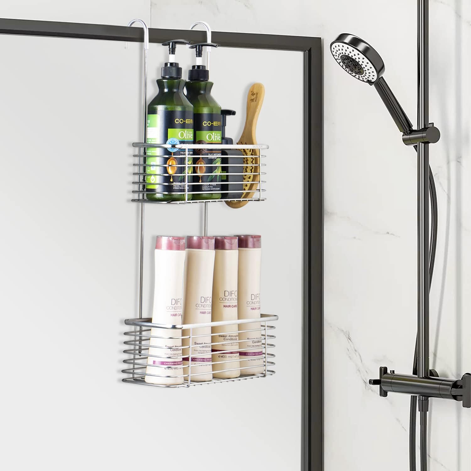 YQh Stainless steel double-layer shower rack, shower room hanging bathroom organizer, storage rack installed on the hanging bar or door, can store shampoo, hair conditioner, shower gel (double)