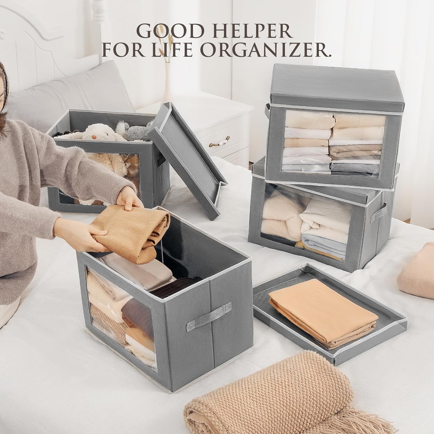 Storage Bins with Lids, 4 Pack Large Storage Cubes with Window, Closet Bins with Lids & Handles, Fabric Box for Organizing Clothes, Towels, Books, Grey