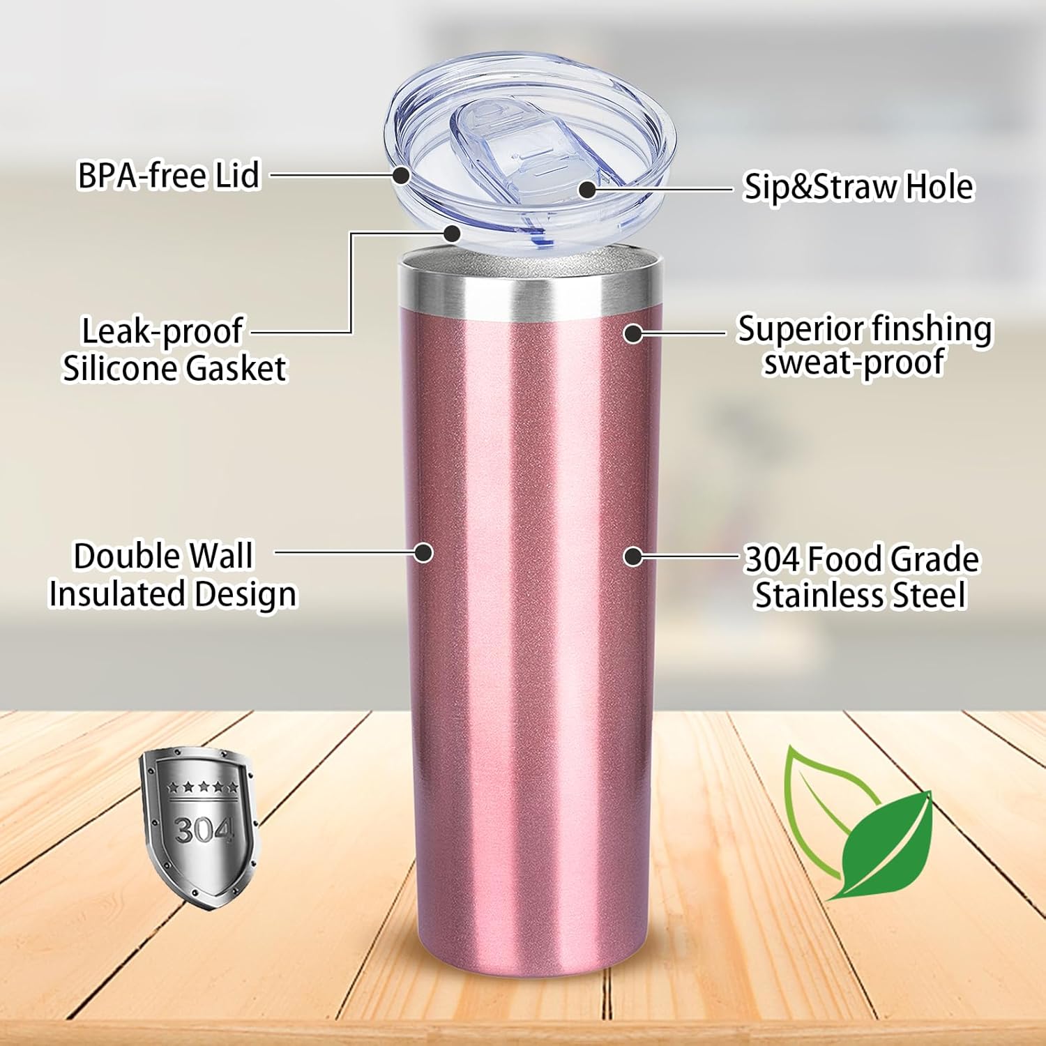 20 oz Skinny Tumblers with Lid and Straw,Stainless Steel Vacuum Insulated Tumbler Cup Double Wall Travel Coffee Mug, Thermal Water Tumbler for Hot and Cold Drinks(Rose Gold,8)