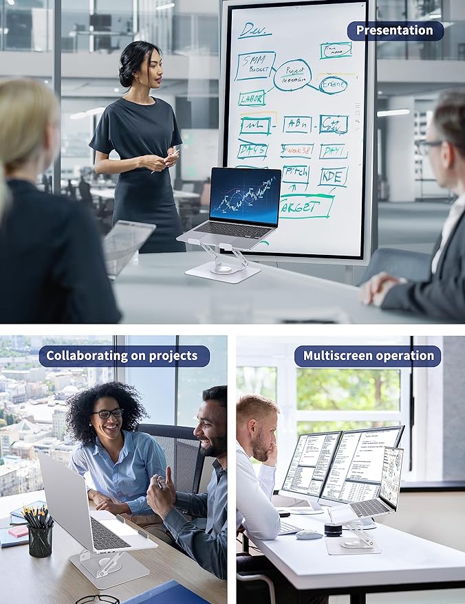 - Collaborate with Ease: The SOUNDANCE laptop stand features a 360° rotatable base, making it easy to share your computer screen with others while collaborating on projects.
