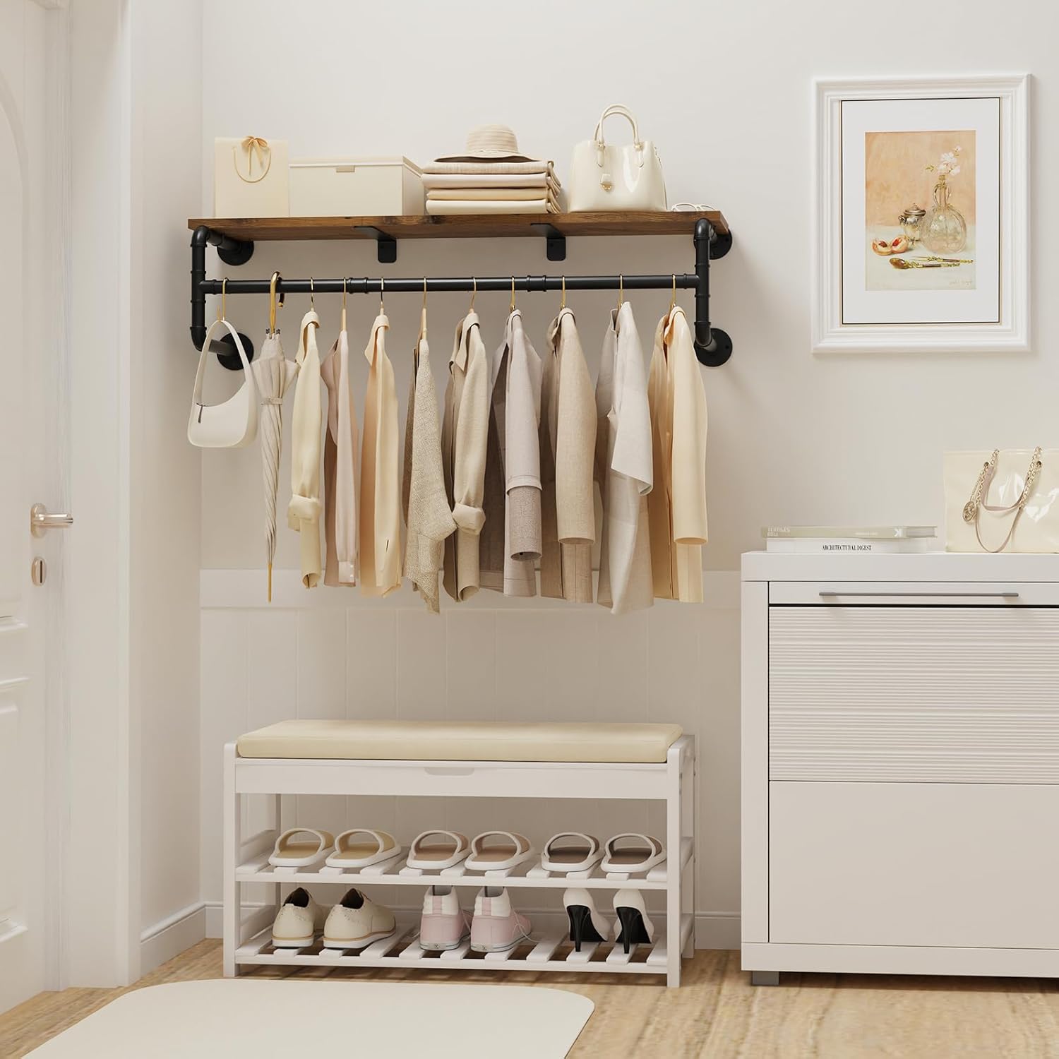 Yawinhe Industrial Pipe Clothing Rack with Shelves, Wall Mounted, Space Saving Closet Rod with 4 Bases, for Shops, Homes, 41.3''Lx10.2''Wx10.2''H, Rustic Brown, 1-Pack