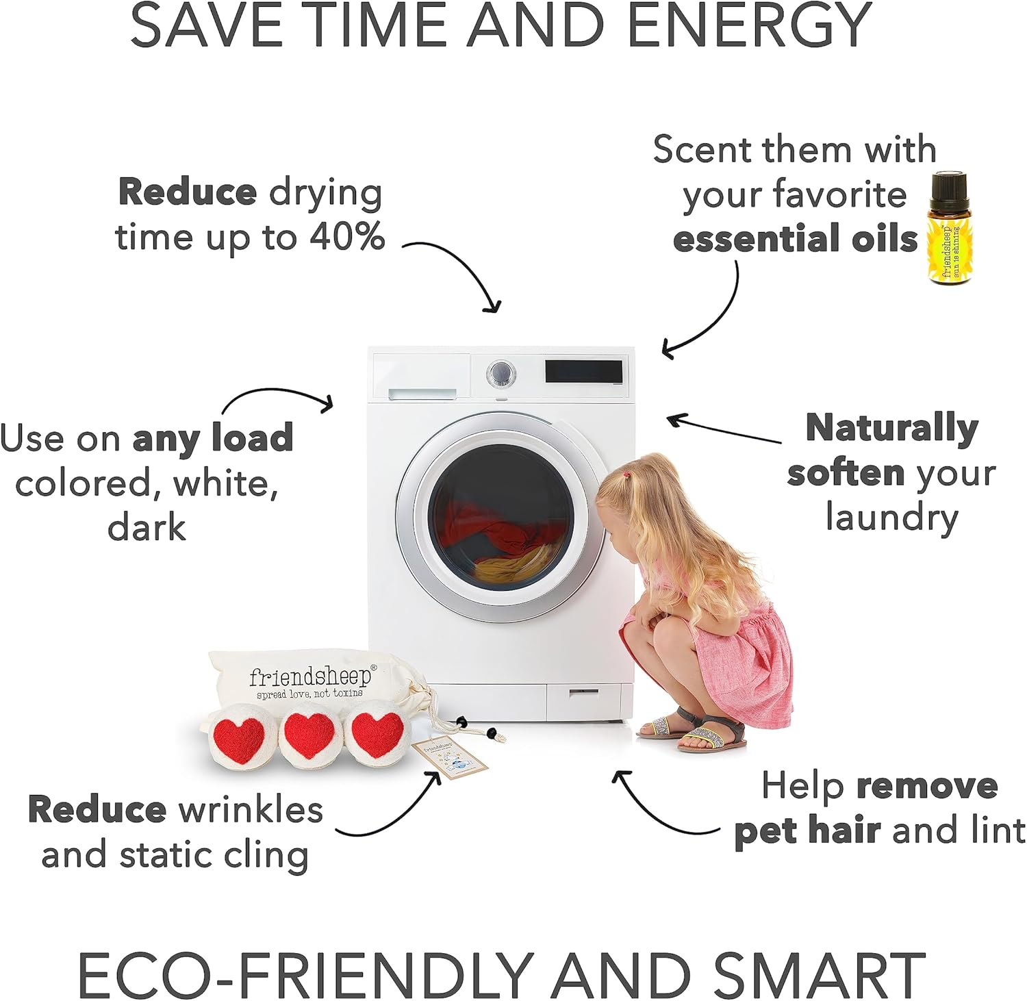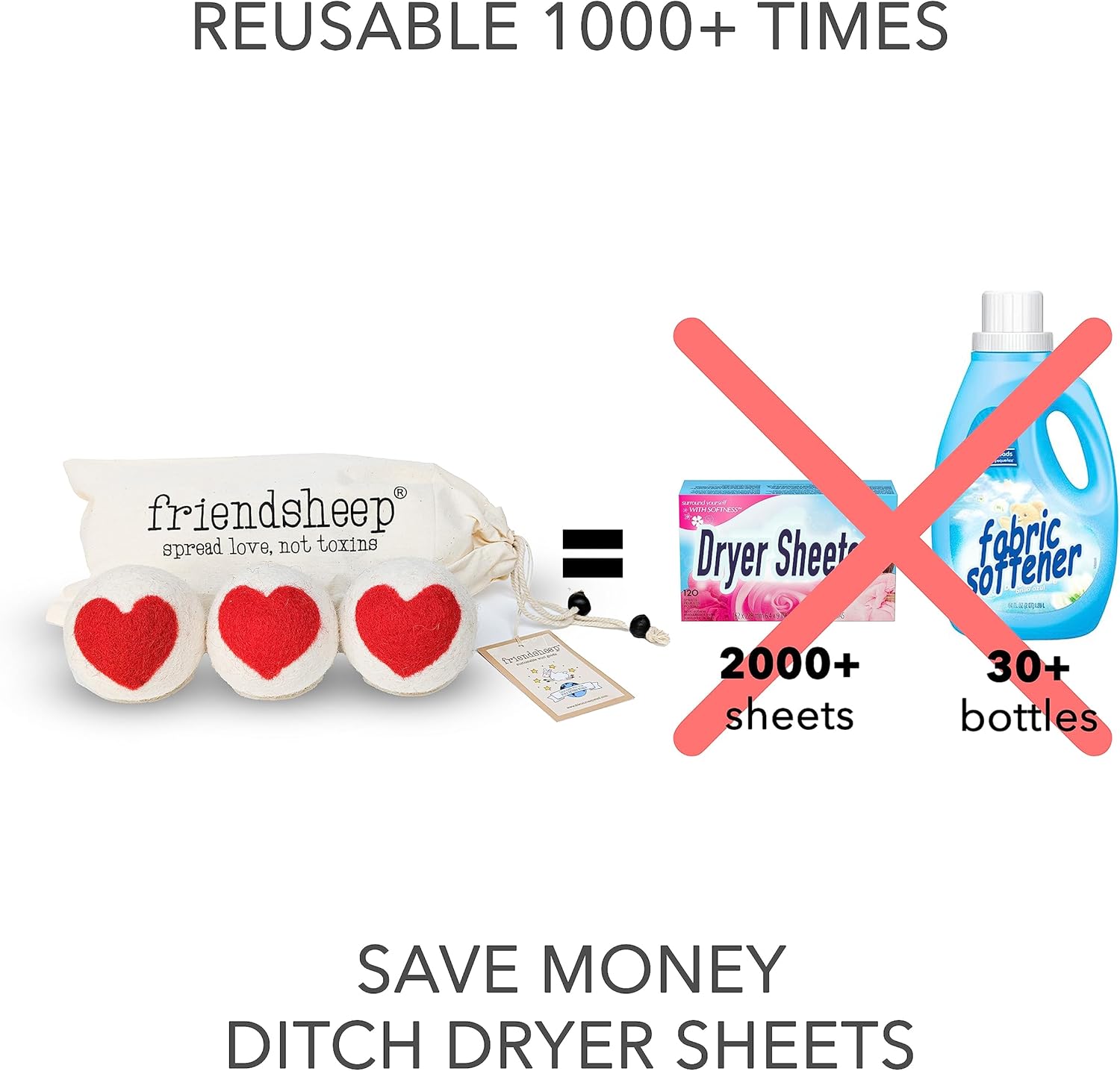 Friendsheep Wool Dryer Balls, Organic Reusable Fabric Softener Alternative for Laundry, Handmade, Fair Trade, Hypoallergenic, Eco-Friendly, Plastic-Free (3 Pack XL – Red Heart )