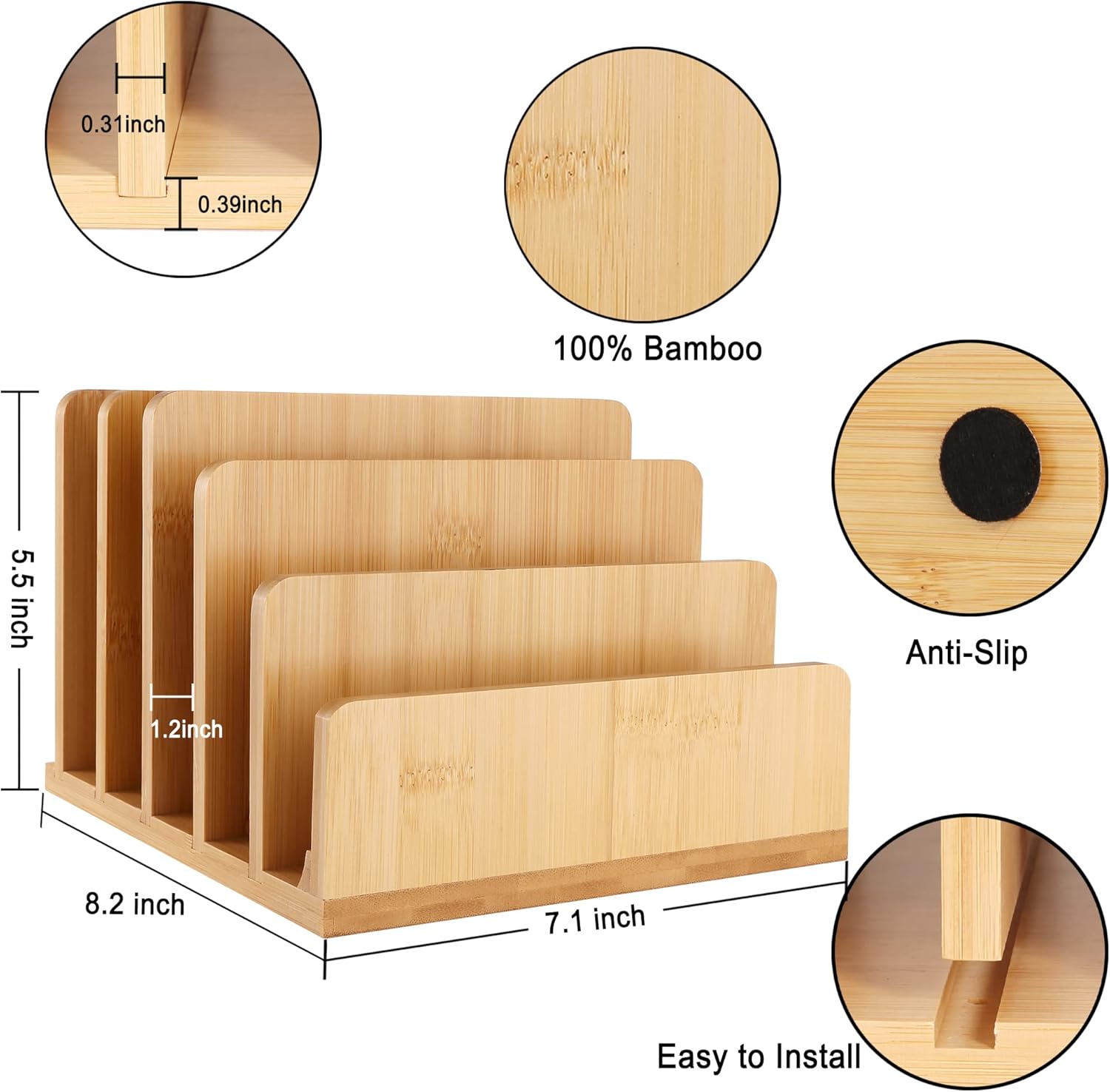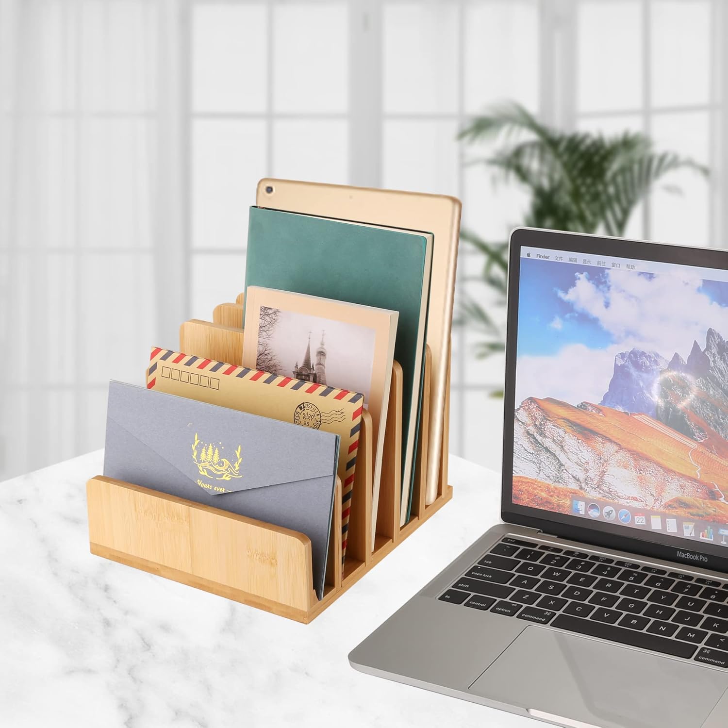 Desk File Mail Organizer Countertop Mail Sorters, Bamboo Desktop Mail Holder, Wood File Paper Holder for Letter Envelope Filing Cell Phone Ipaid, Organizer Tray for Office & Home (5 Slots)