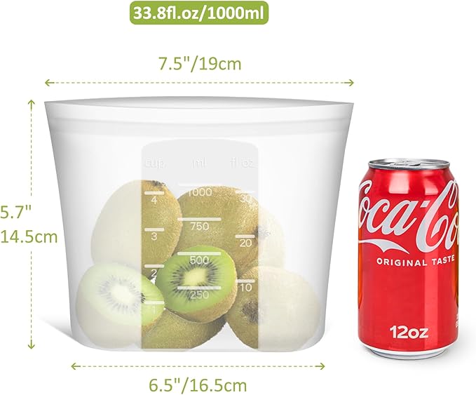 - 【THOUGHTFUL & ECONOMICAL】Small size: 33.8fl.oz/1000ml. This silicone ziplock bag features clearly marked measurements in cups, milliliters, and fluid ounces for easy use. The translucent body helps to get a glimpse of what's inside, though not in crystal clear detail. Its robust construction ensures improved strength and durability. Plus, One silicone bag can reduce up to 300+ single-use plastic bags a year, helping to create a waste-free world and save you a lot of money.