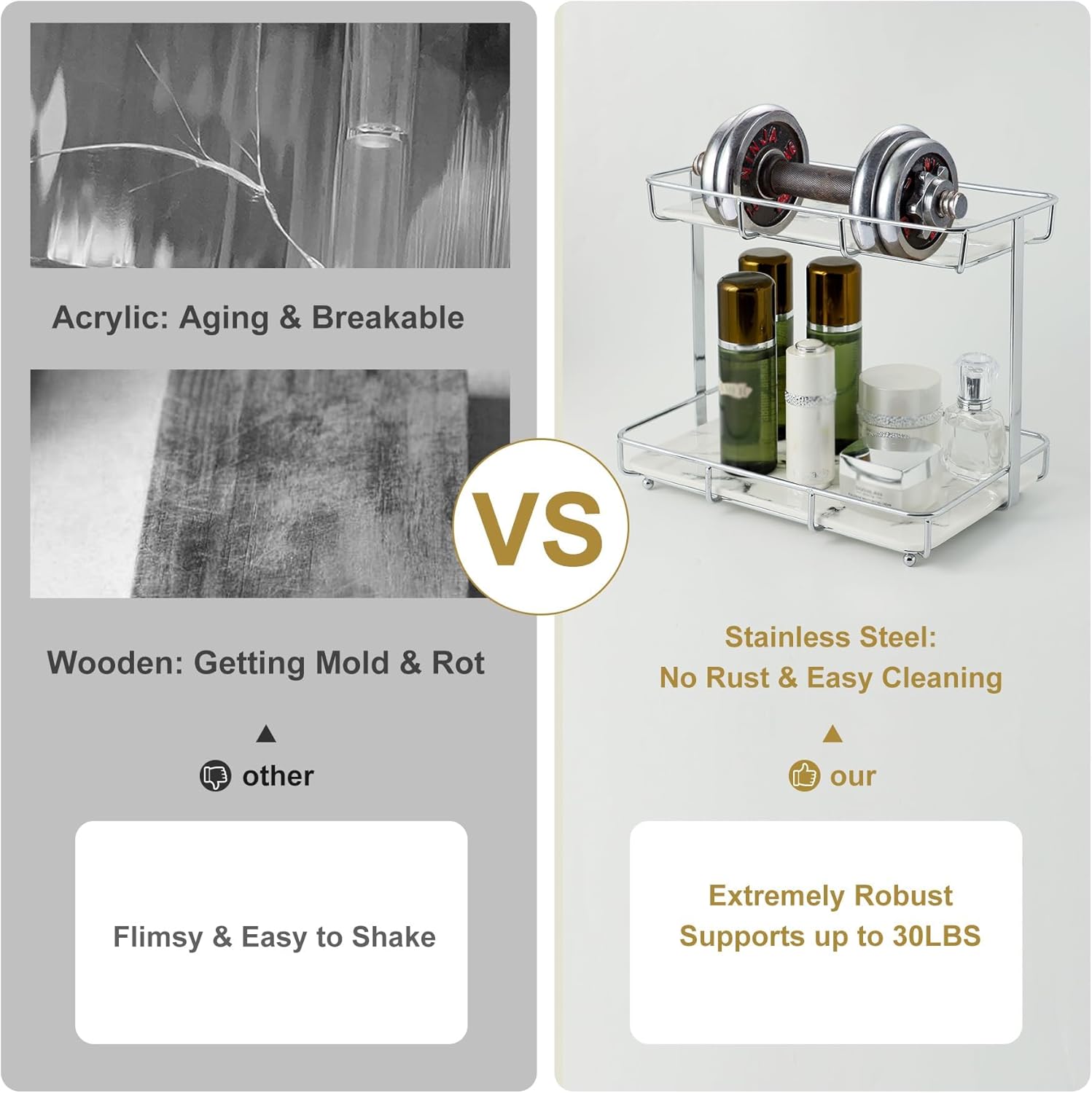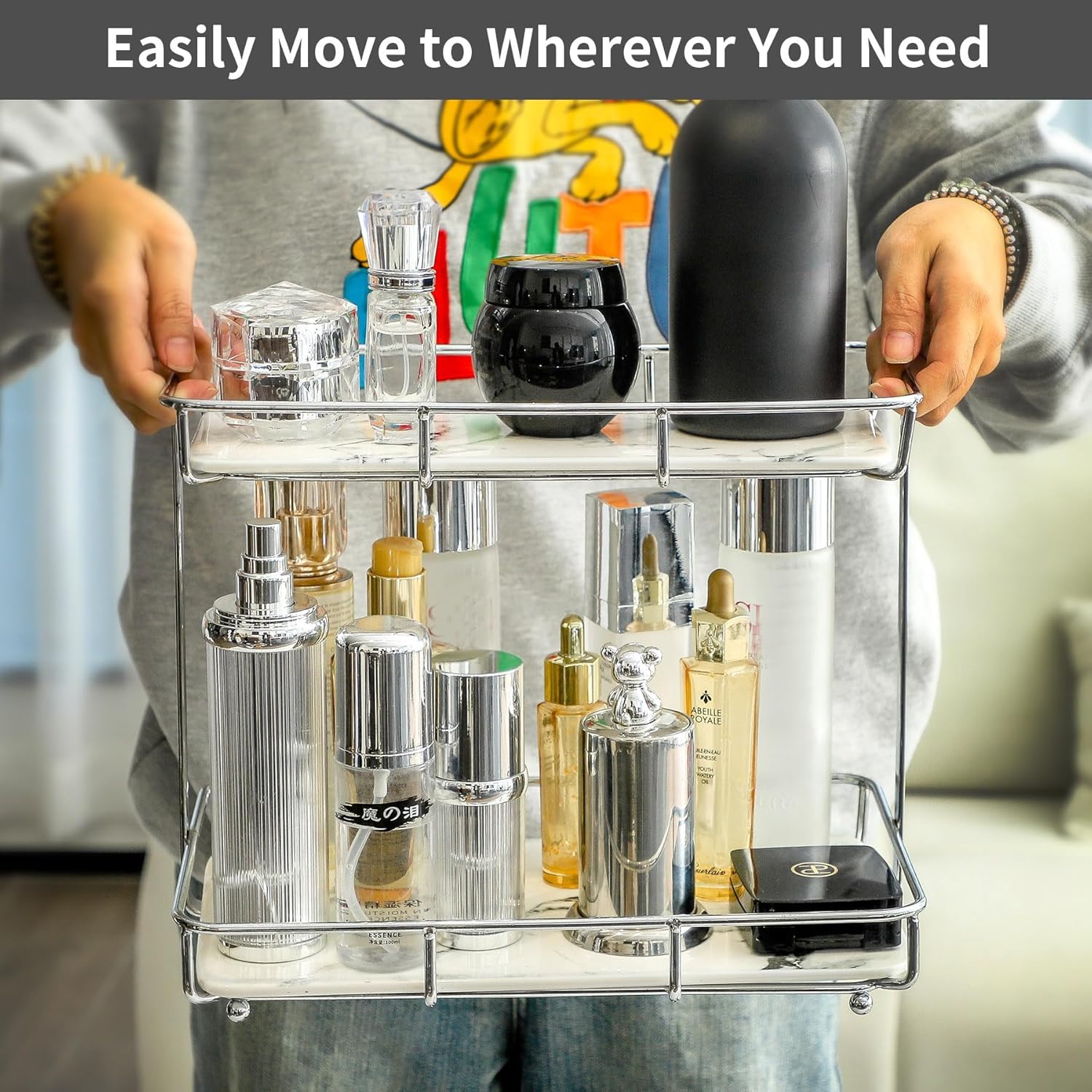 - EASY TO CLEAN: With a sturdy stainless steel frame that can prevent corrosion in wet places and removable ceramic trays with a luxurious marble pattern, this dresser top stand is both functional and easy to clean.