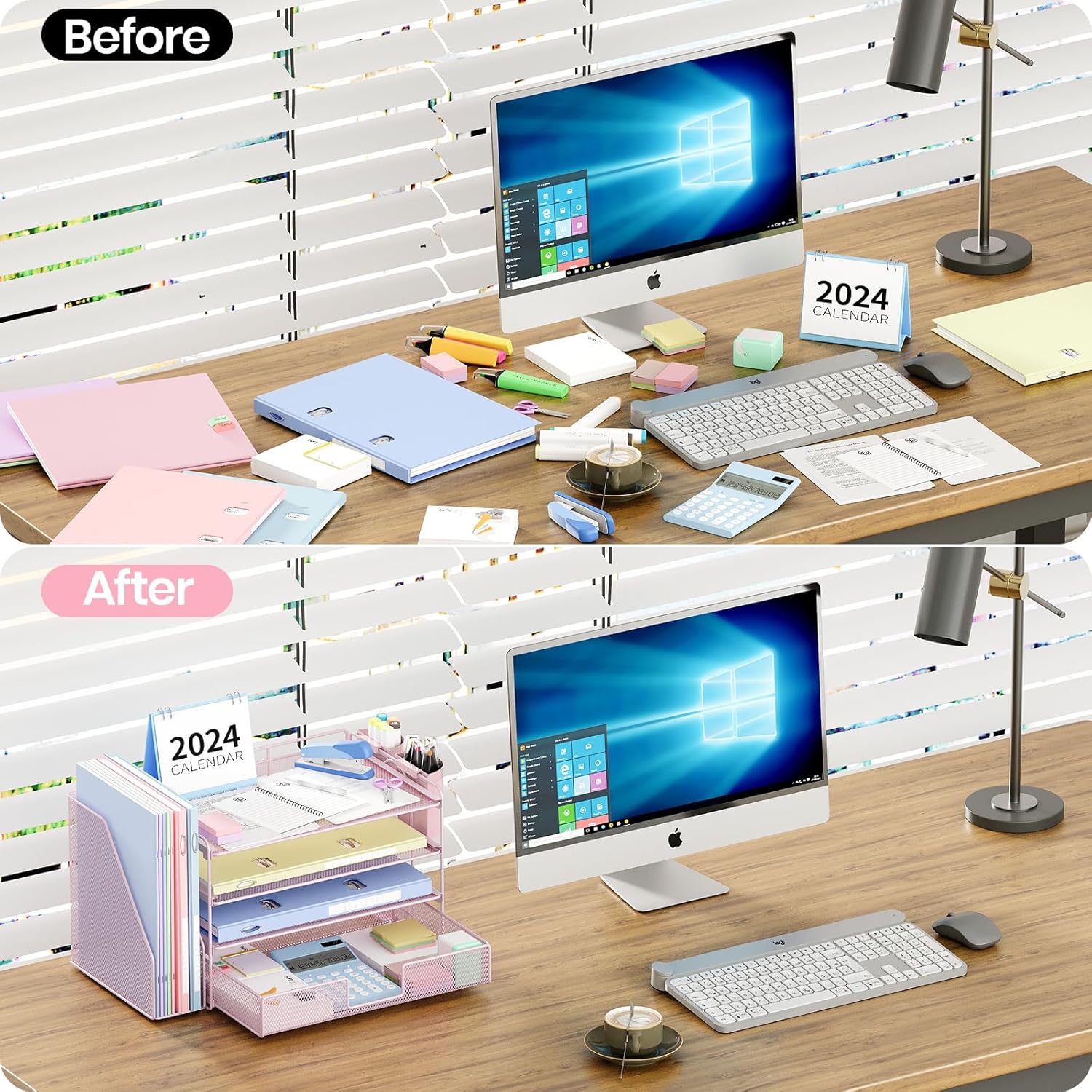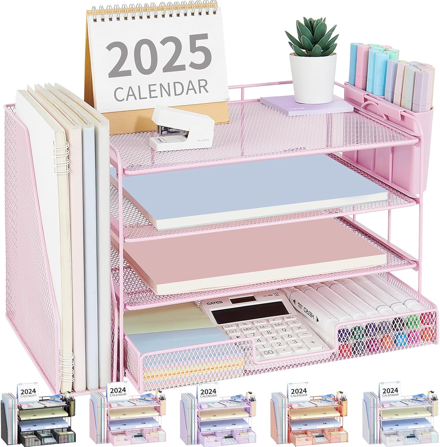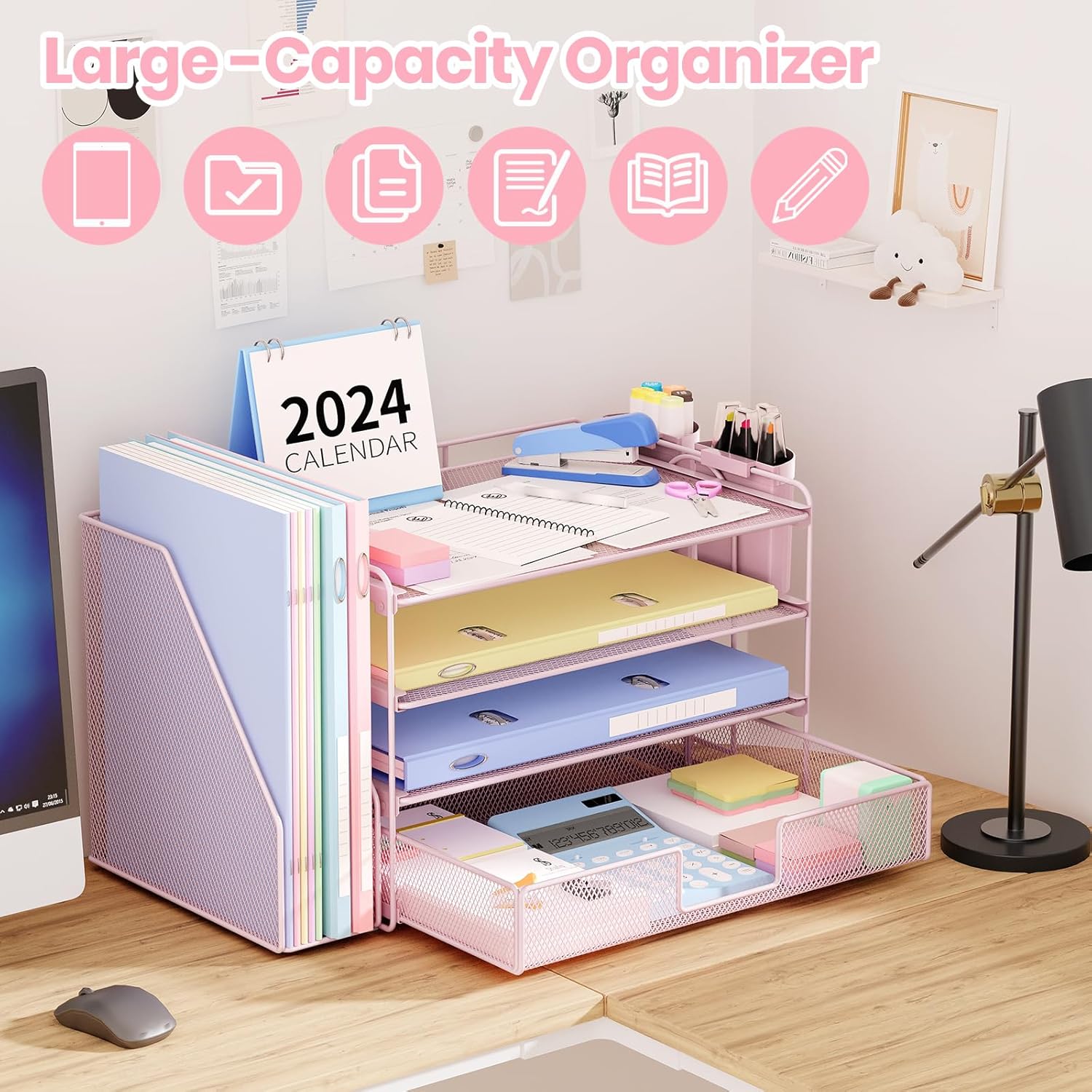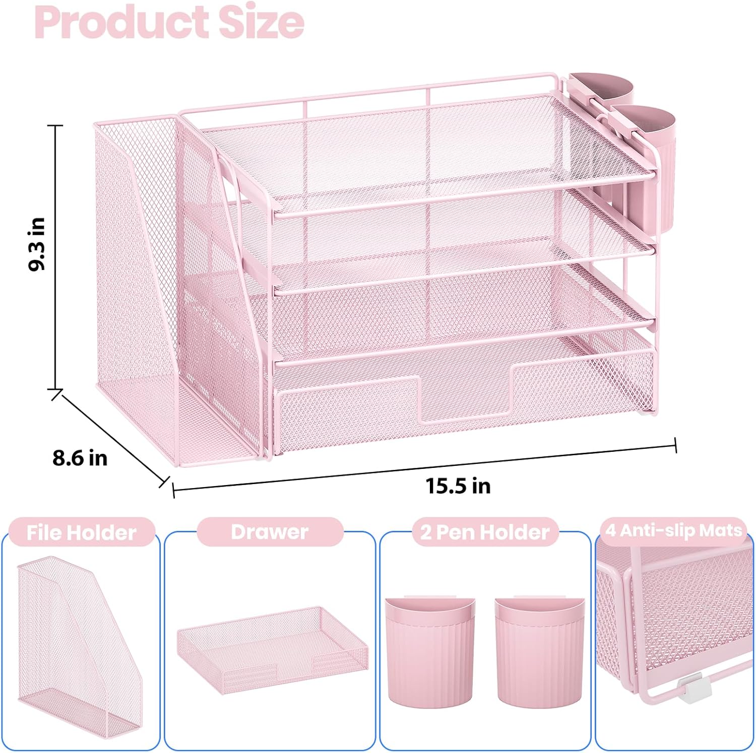 Desk Organizer and Accessories, 4-Tier Desktop File Organizer with Drawer and 2 Pen Holders, Office Desk Accessories, File Sorters, Workspace Organizers for Office Supplies(Pink)