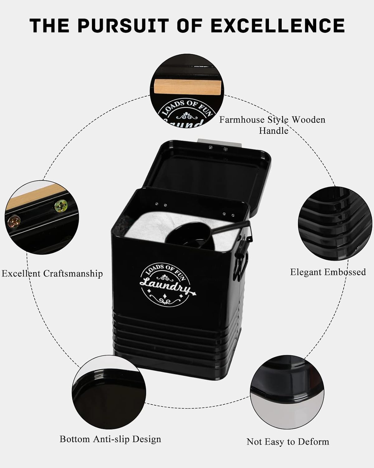 - HIGH-QUALITY MATERIAL: Our laundry powder container with a lid made of sturdy Galvanized iron, This laundry detergent dispenser is spacious enough with 7(L)*6(W)*9(H) inch size dimensions. It ensures long-term durability, perfect for everyday use. The laundry detergent holder holds up to 100oz of powder detergent