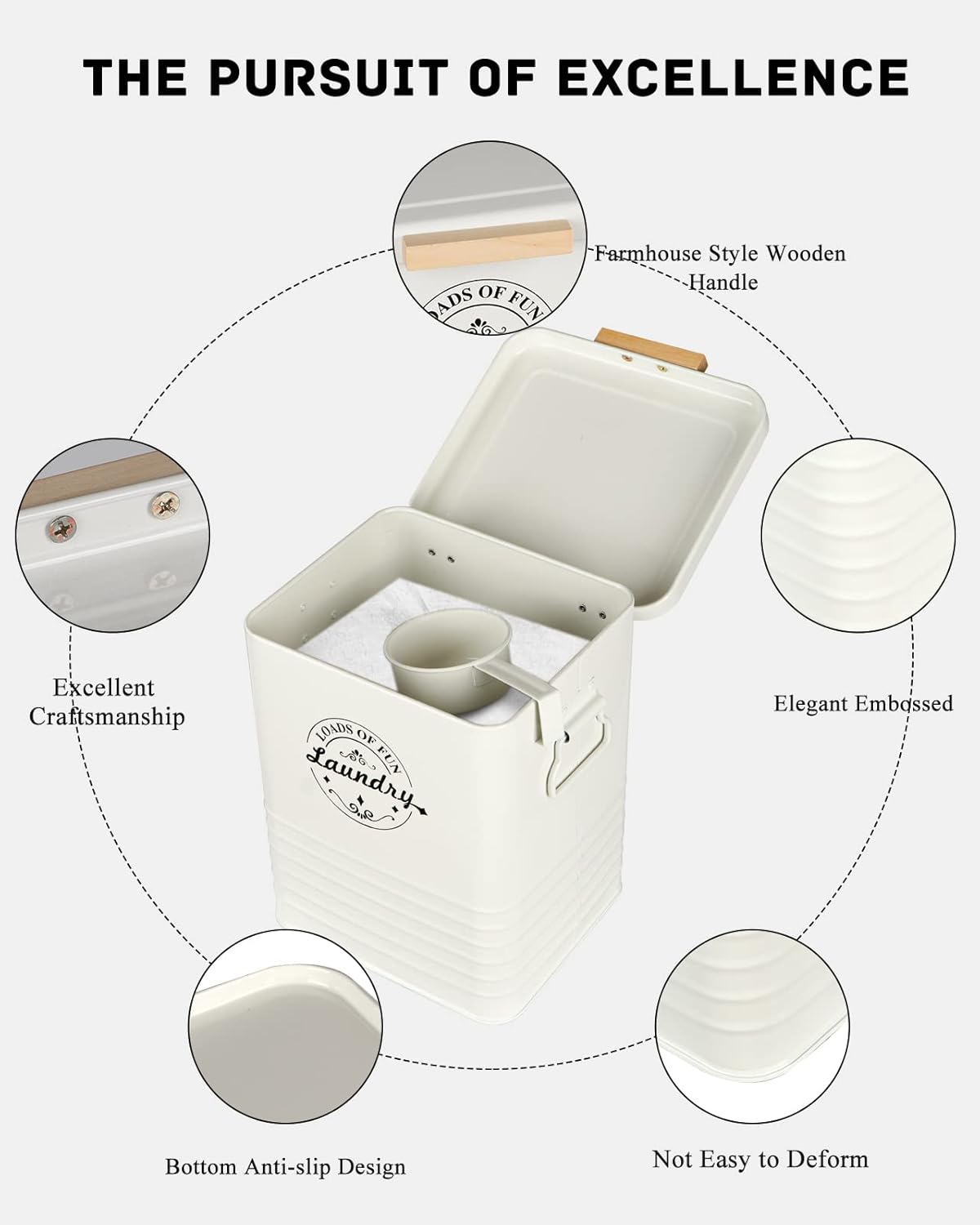 - HIGH-QUALITY MATERIAL: Our laundry powder container with a lid made of sturdy Galvanized iron, This laundry detergent dispenser is spacious enough with 7(L)*6(W)*9(H) inch size dimensions. It ensures long-term durability, perfect for everyday use. The laundry detergent holder holds up to 100oz of powder detergent