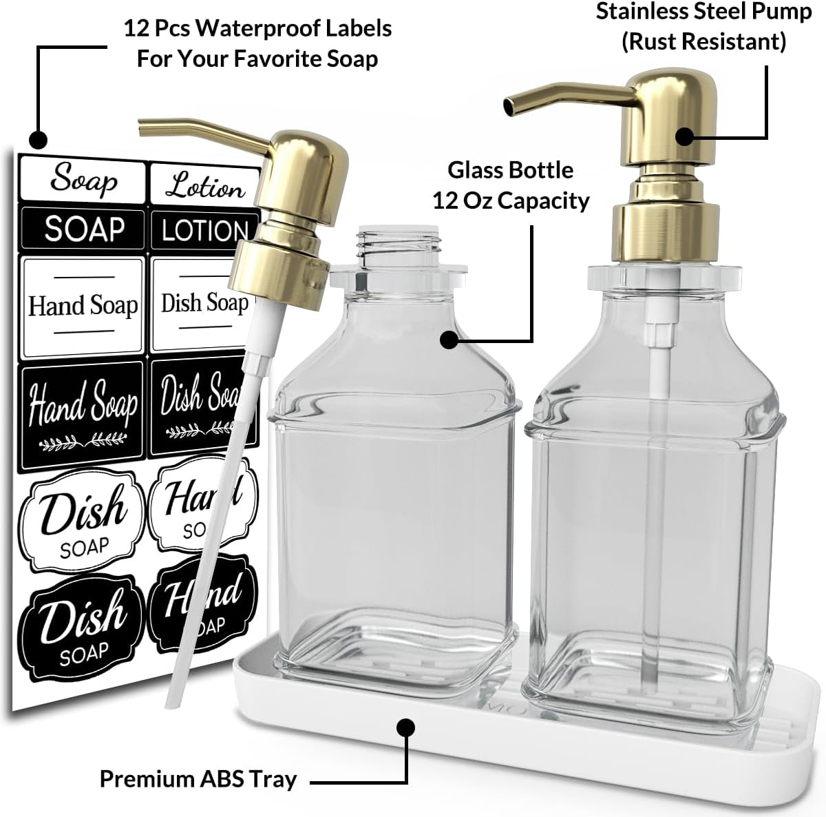 - Superb Quality Soap Dispenser - Made Of thickened High-Quality Glass, natural and safe to fill with a variety of room-temperature daily use liquids. Anti-fingerprint, the Sturdy Pump Is Made By Premium Gold Color Soap Dispenser Pump Which Can Kept Long Lasting Bright That Not Easy Corrode Or Rust. Reusable & refillable soap dispenser set helps you get organized.