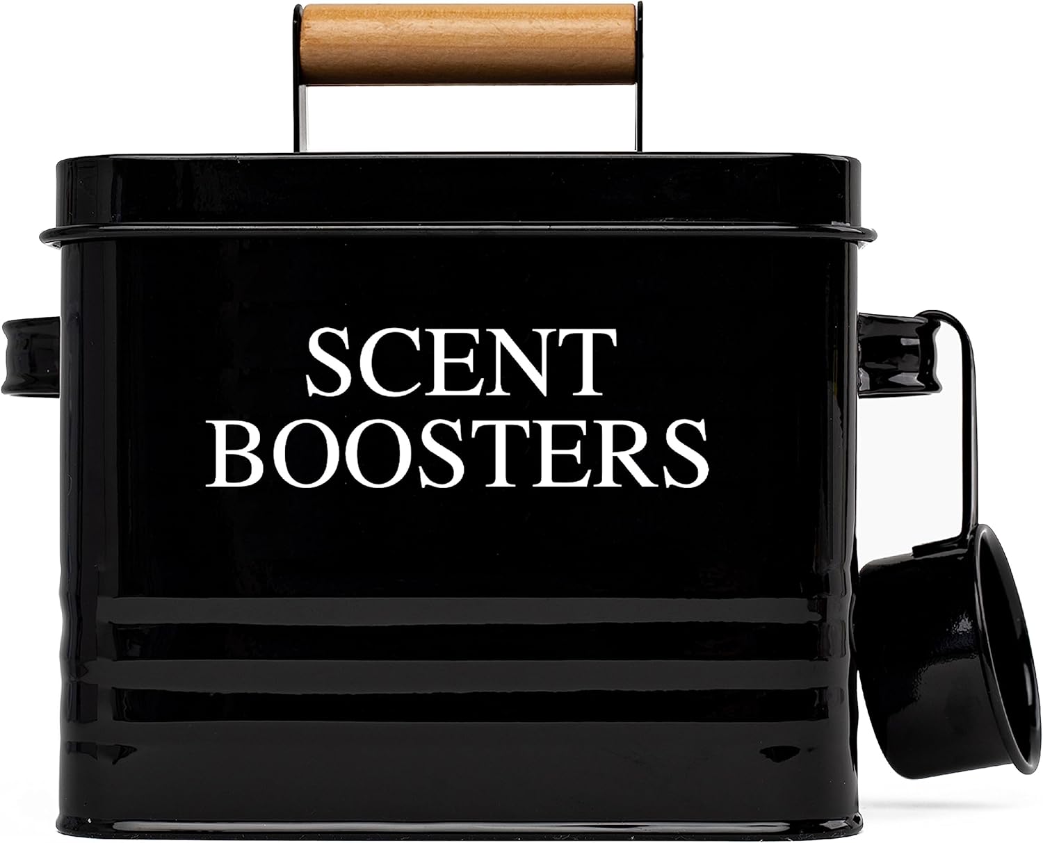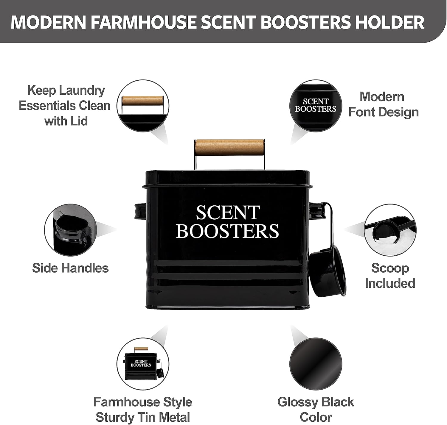 - MODERN FARMHOUSE DESIGN: Modern font of ‘scent boosters’ is printed on a farmhouse style tin metal storage container with a wooden handle lid providing modern farmhouse touch to your laundry room. Design of this scent boosters container will blend seamlessly with any laundry interior scheme and is a wonder alternative to plastic scent boosters containers