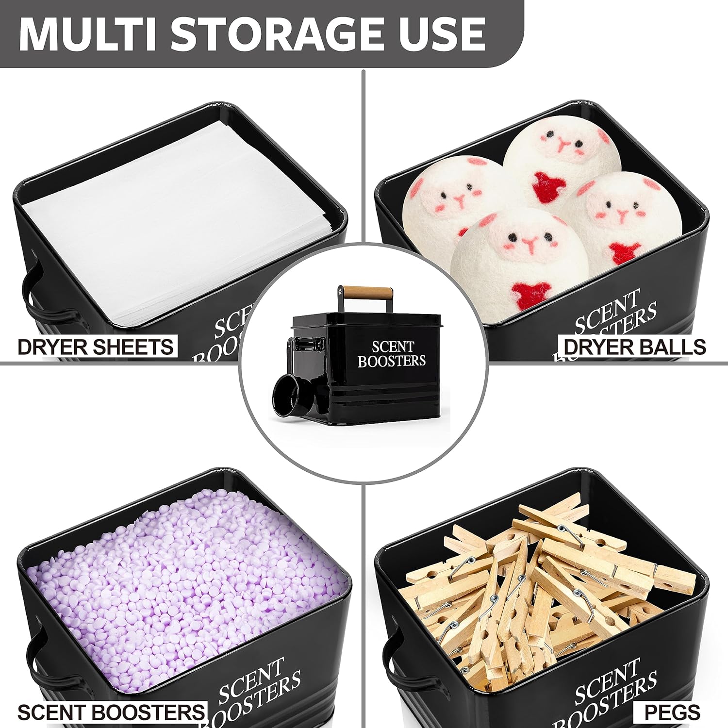 - MULTI-PURPOSE STORAGE TIN: Why limit the purpose of this storage tin for scent boosters only? This storage tin is perfect to store not only the scent boosters but dryer sheets, dryer balls, lint, pegs, laundry pods, laundry powder, and so much more. This is a great space saving laundry room organization and storage container