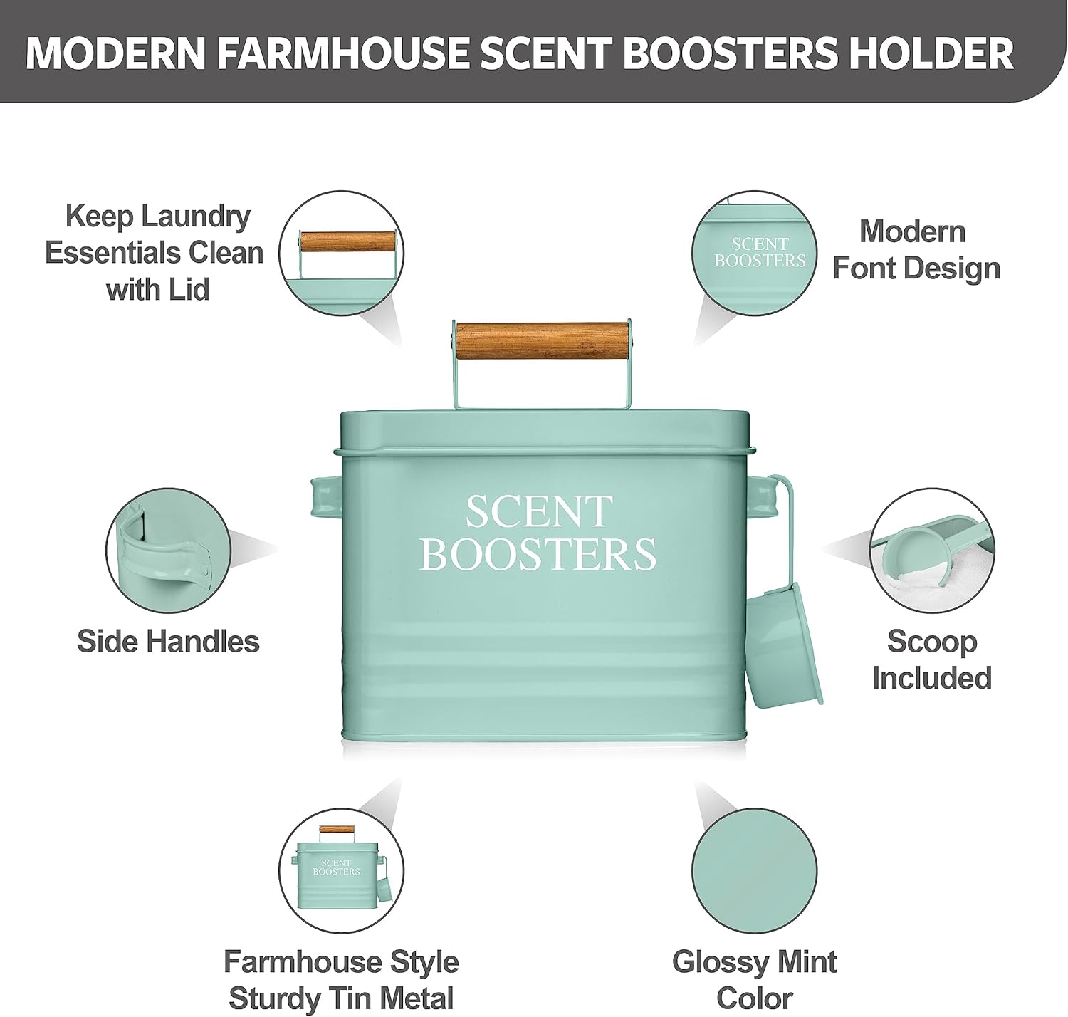 - MODERN FARMHOUSE DESIGN: Modern font of ‘scent boosters’ is printed on a farmhouse style tin metal storage container with a wooden handle lid providing modern farmhouse touch to your laundry room. Design of this scent boosters container will blend seamlessly with any laundry interior scheme and is a wonder alternative to plastic scent boosters containers