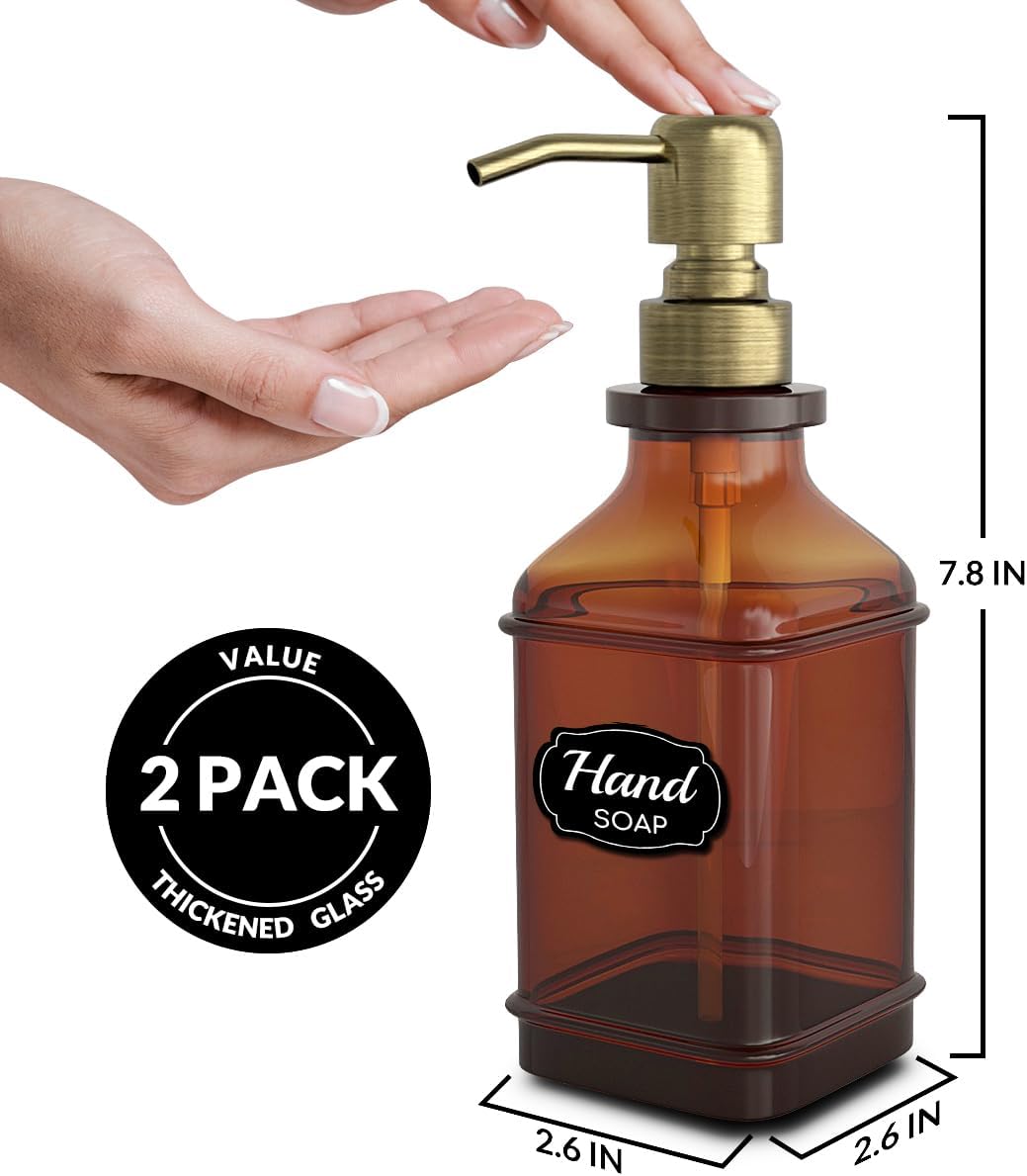 Soap Dispenser - 2 Pack, Antique Design Thick Amber Glass Hand Soap Dispensers with Sturdy Tray; 304 Rust Proof Stainless Steel Black Pump, 12Pcs Stickers, for Kitchen, Bathroom - Brushed Gold