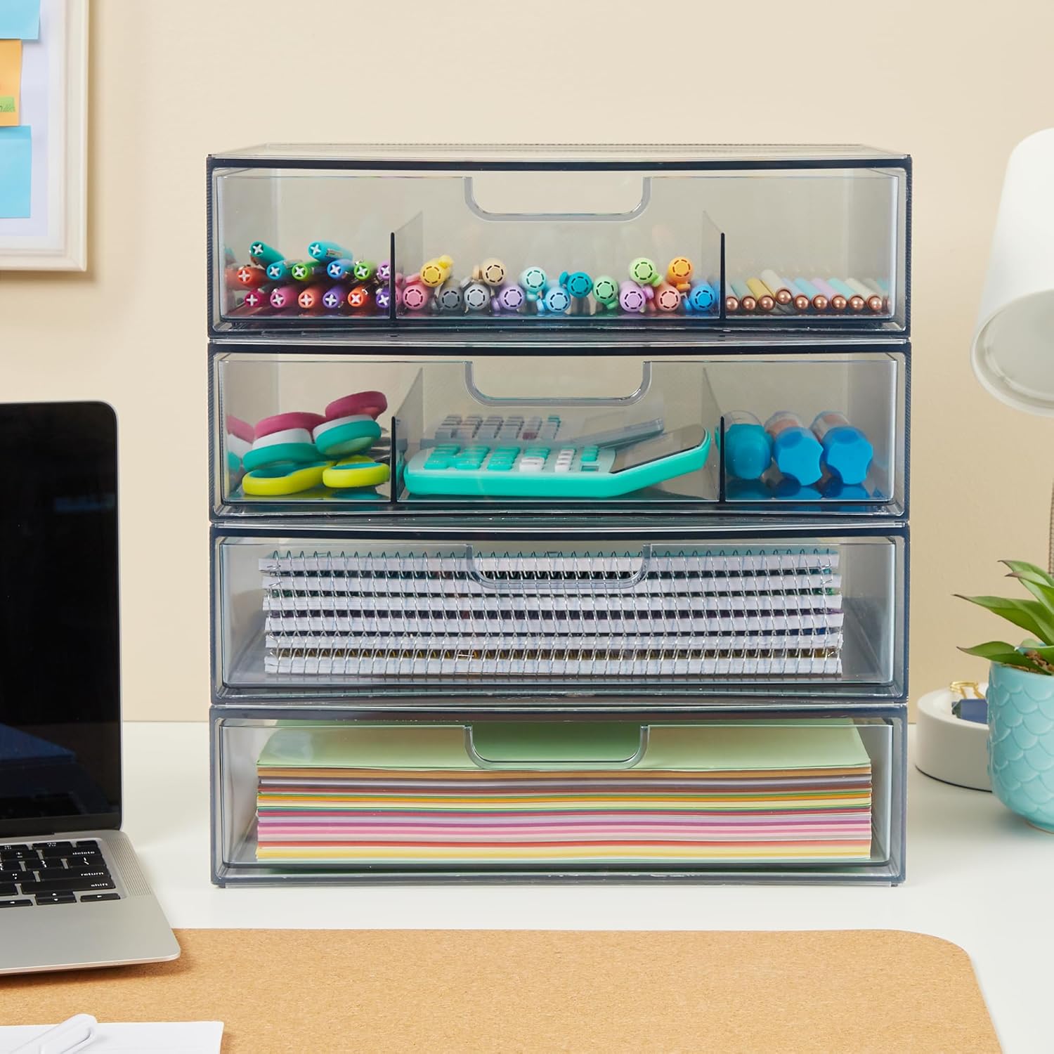 - Multipurpose storage bins will help maximize space around the home, allowing you to keep every room tidy. Organization and storage with these acrylic containers allows you to find what is in each quickly, making organizing fast and easy. Removable divided storage drawer sorts pens, markers, and pencils and the open drawer is great for storing papers and notebooks