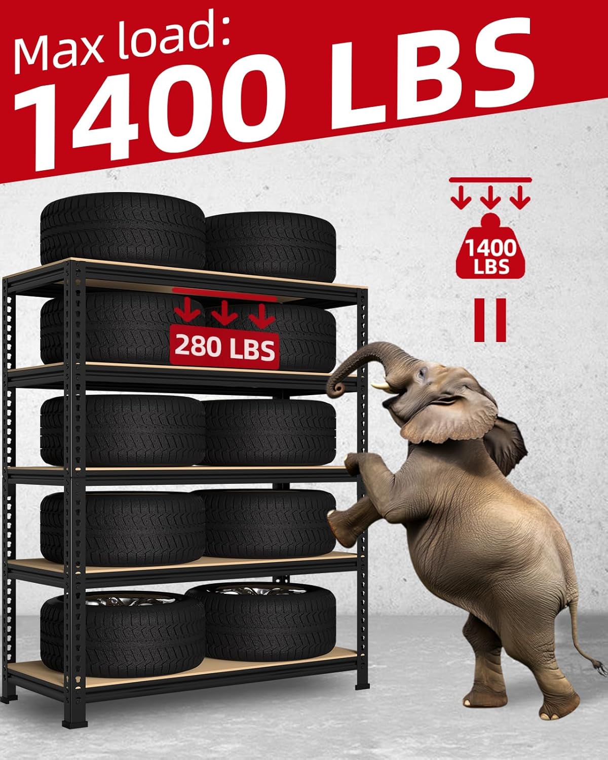 - 【 HEAVY DUTY & LONG-LASTING】: This 5-tier garage shelving is made of high-quality 0.3" thick MDF boards and heavy duty galvanized metal frame, sturdy and enduring. The metal frame is covered with premium powder coating to give it a smooth surface. Each shelf holds up to 280 lbs, 5 tier shelves' total max load weight is 1400 lbs
