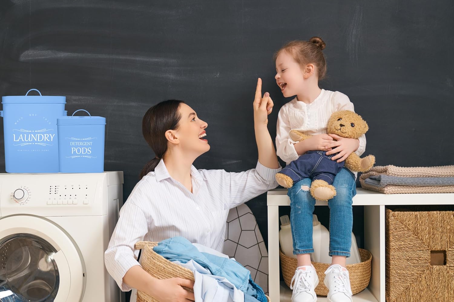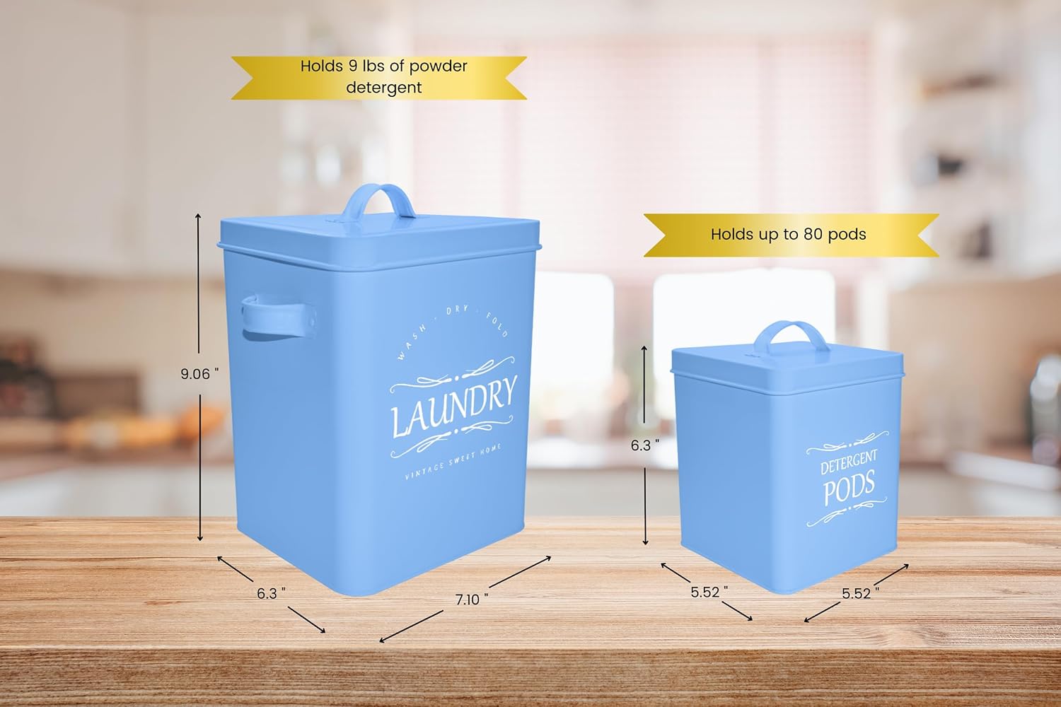 Meraki Home Laundry Detergent Container Set ā 2-Pack Detergent Holder and Pods Container with Metal Scoop ā Farmhouse Canisters for Laundry Room Organization and Storage - Matte Blue
