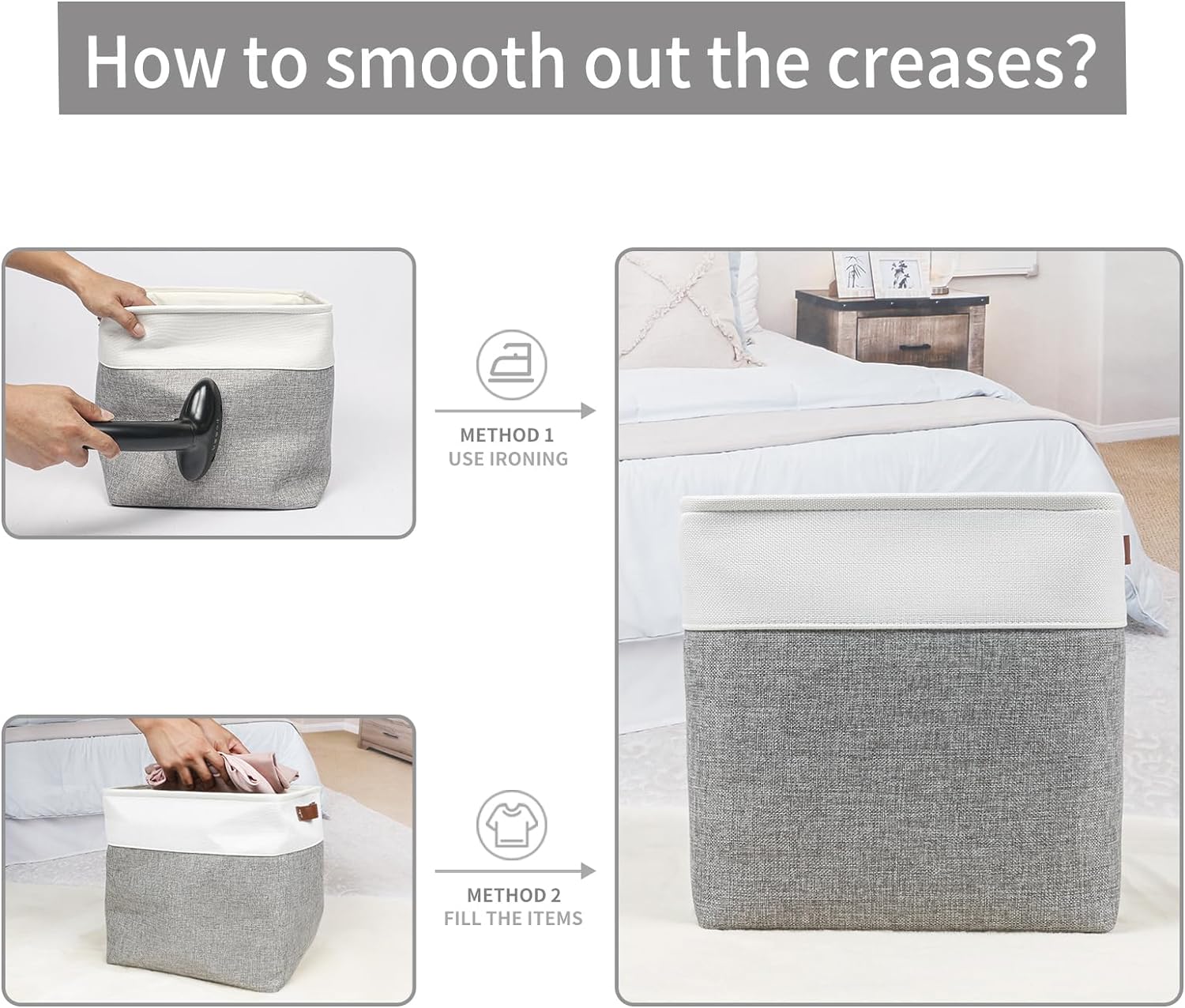 - 【Maintenance & Care Tip】 - Collapsible design for space saving. Our foldable baskets comes in a compression packing which may result in wrinkled storage bin during the long transit. Get rid of the wrinkles by either stuffing the fabric storage bins with blankets and pillows for a few days or steam iron them at low-heat setting. The organization baskets are easy to clean, you can dust the basket with a soft cloth with light soapy water when needed. Not recommended to machine wash.