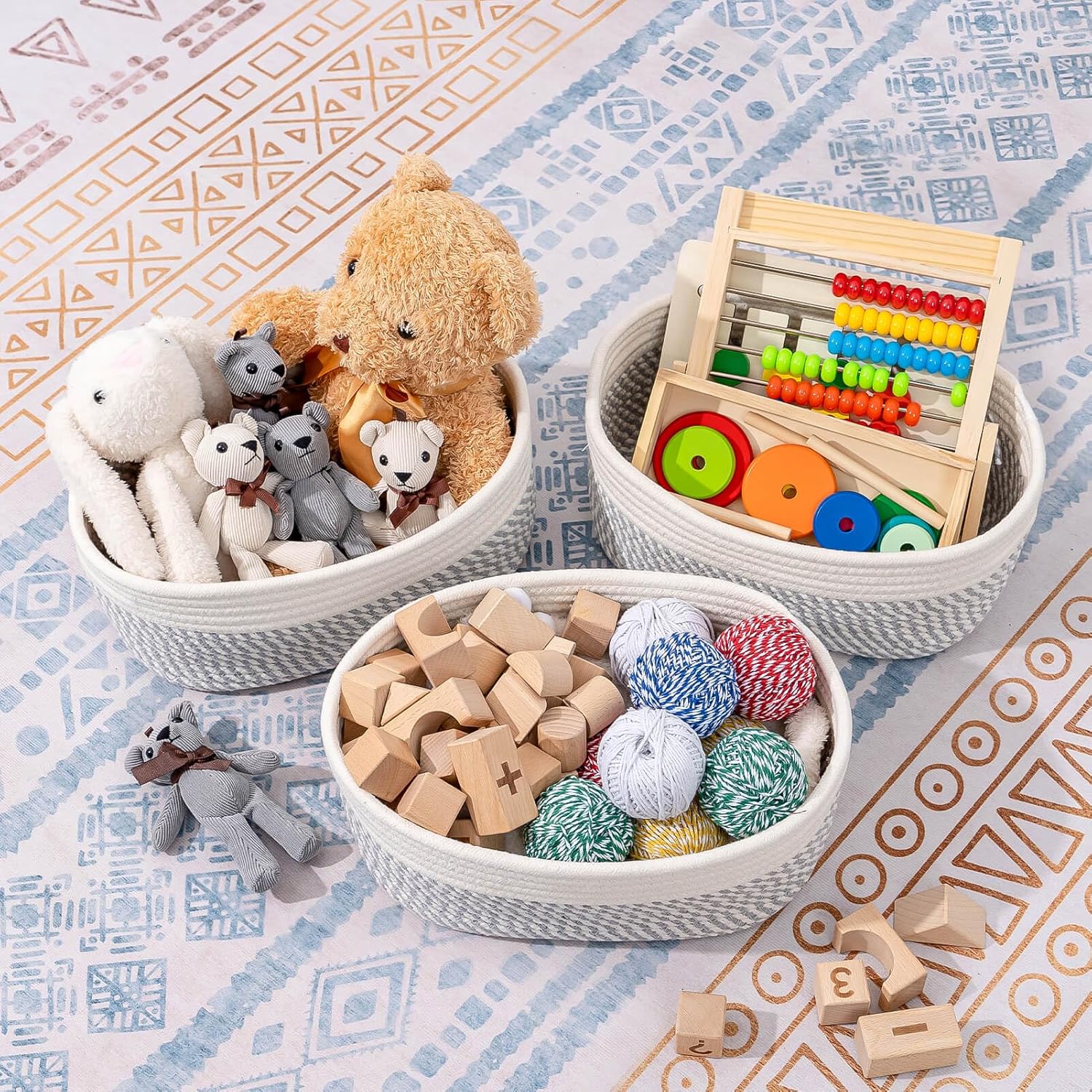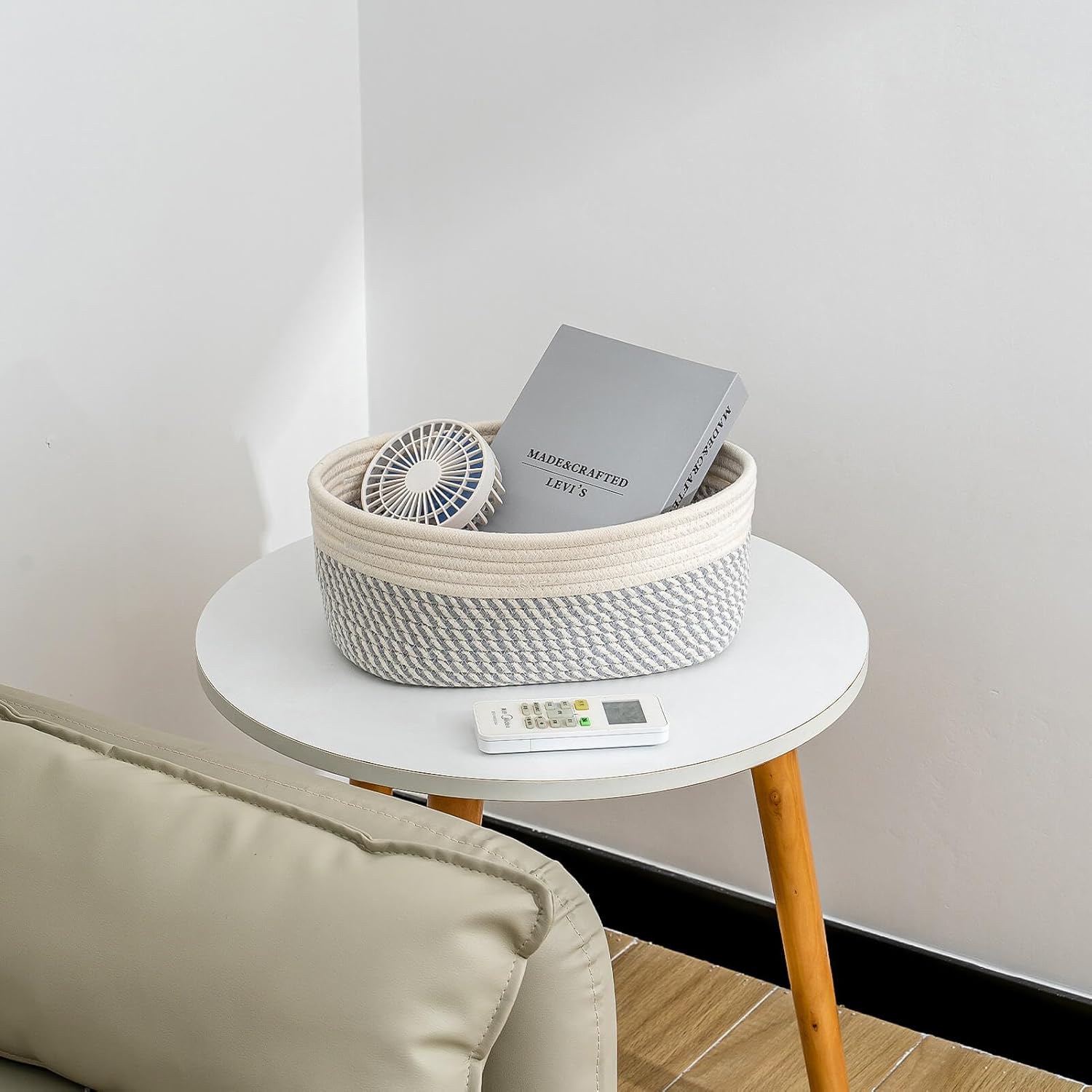 - Classy Natural Cotton Rope Storage Baskets-High quality well made. Very sturdy and a cute modern style. Durable woven rope, Long-lasting, skin-friendly, soft and attractive. You need these adorable baskets to put some supplies in, diaper, jewelry, cosmetics, makeup brushes, tea bags, storing smaller toys, toddler socks, candy