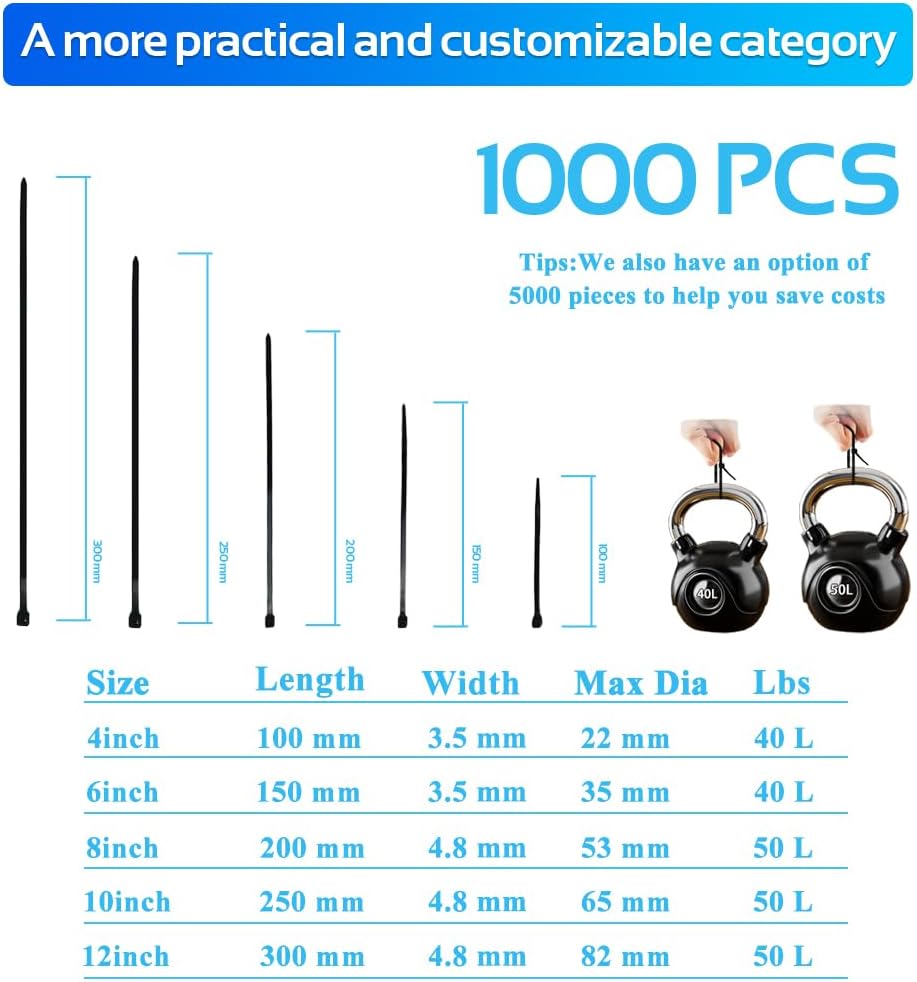 - High Tensile Strength: The 1000Pcs 8Inch Black Cable Tie Zip Ties are industrial level heavy-duty ties with a tensile strength of 50 pounds, making them strong enough to secure and organize a variety of items.