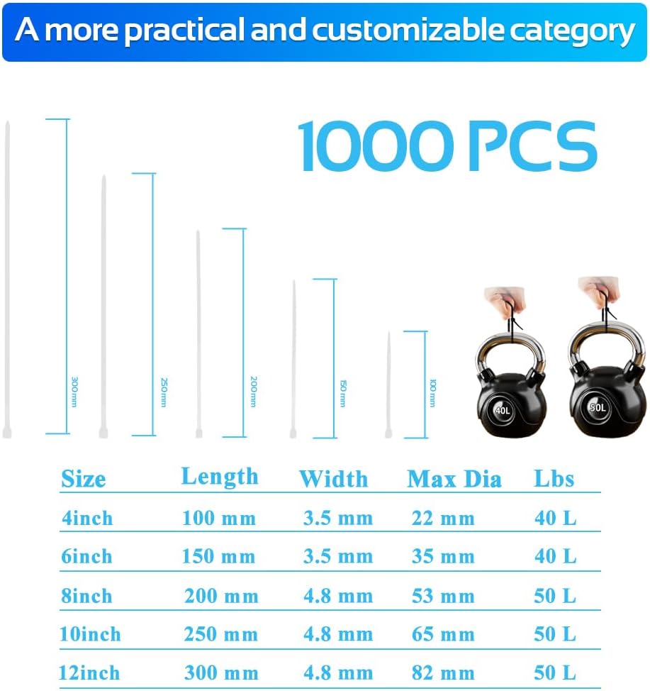 - High Tensile Strength: The 1000Pcs 8Inch White Cable Tie Zip Ties are industrial level heavy-duty ties with a tensile strength of 50 pounds, making them strong enough to secure and organize a variety of items.