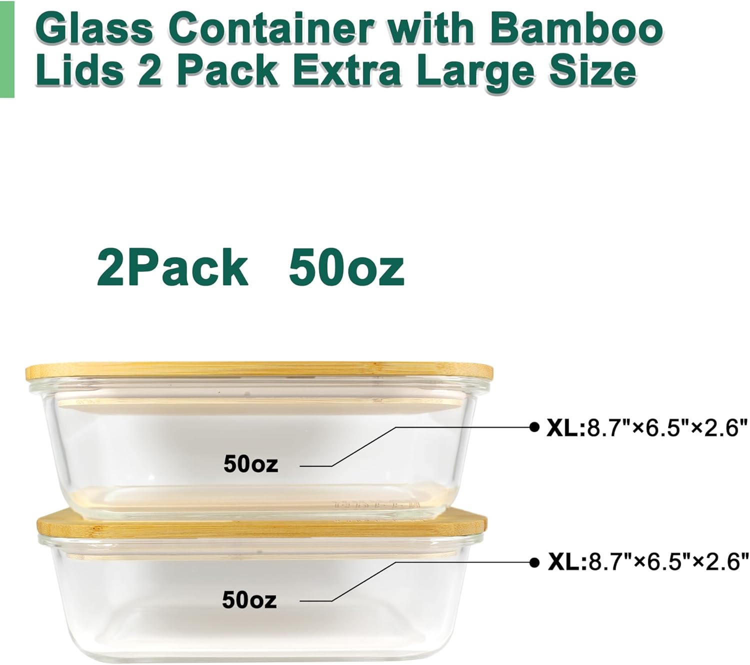- ✅2 PACK of LARGE SIZE: 2 Pack of X Large Size, Glass Container size without Bamboo Lid is 50OZ dimension (8.7x6.5x2.6), it is perfect for family size meal, great choice to cook or store a large portion of food. Our Bamboo Lid is airtight lid not leak proof lid. Bamboo Lid is not recommended to wash in dishwasher.