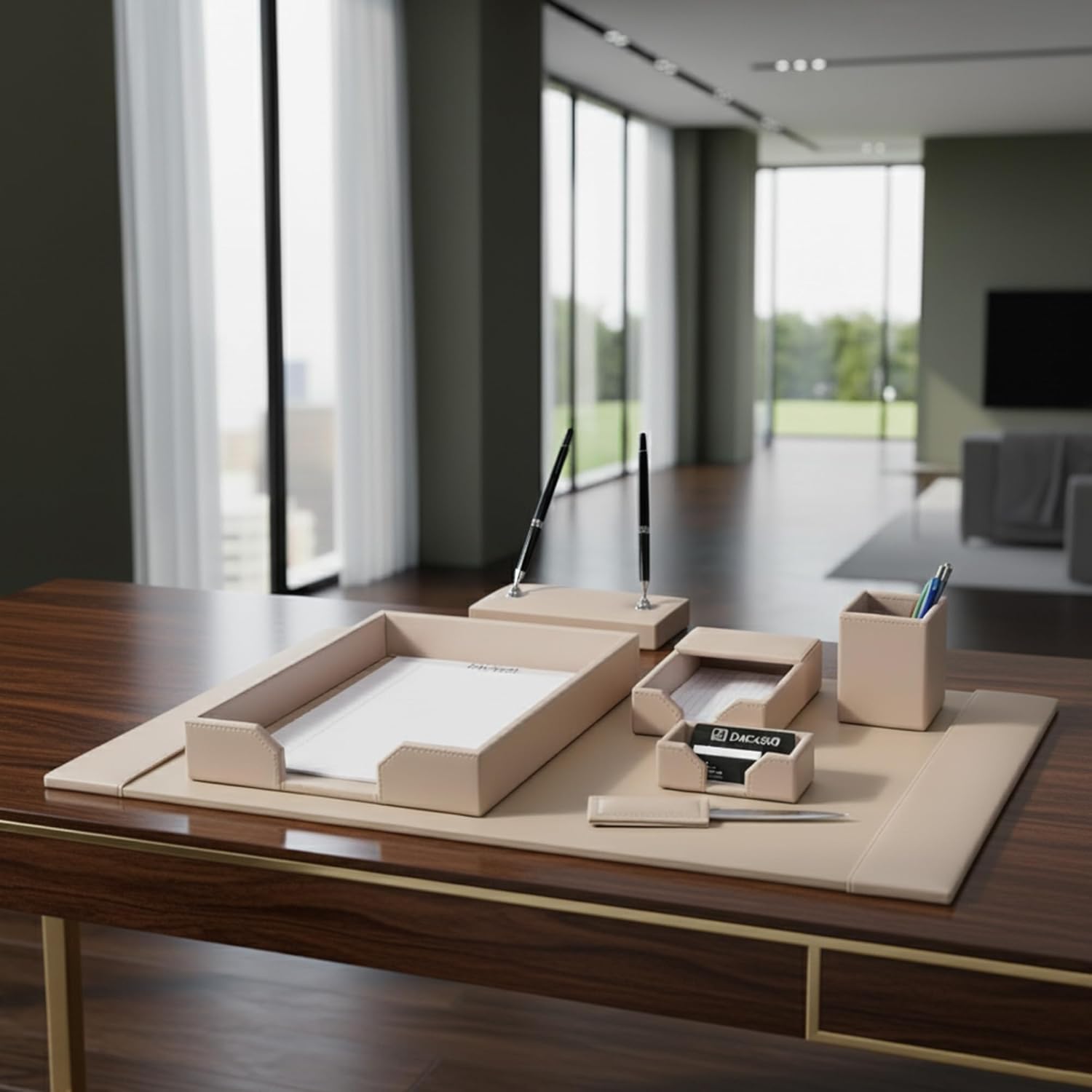 Dacasso Bonded Set Luxury Leather Desk Pad & Desk Organization Essentials, 7 Piece, White Latte