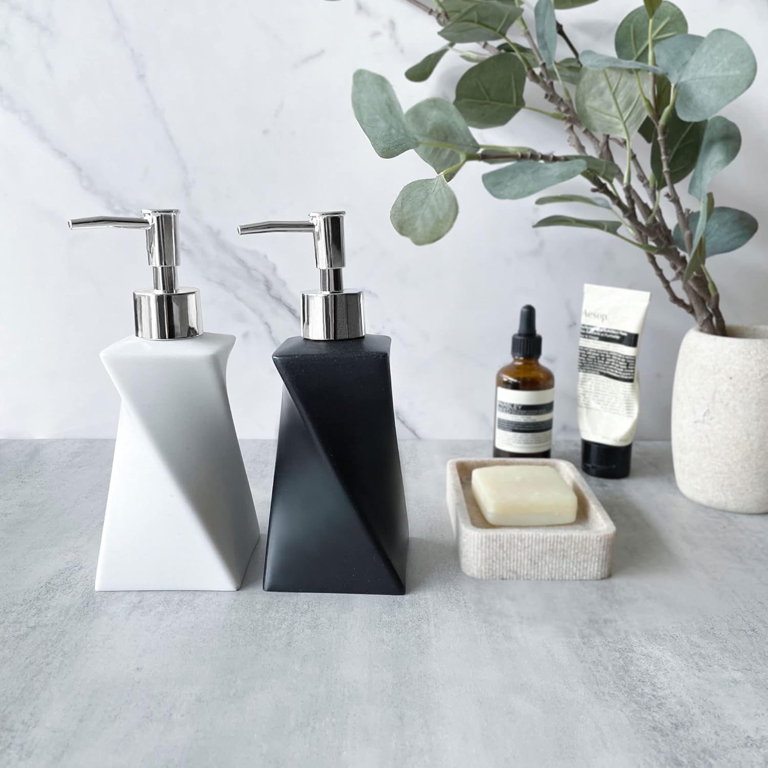 2 Pack Modern White & Black Soap Dispenser Set with Silver Pump for Bathroom and Kitchen, Contemporary Art Style, Matte Finish, Rust Proof, 8.5oz