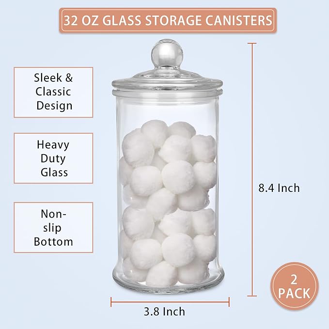 2 Pack Glass Apothecary Jars with Lids, 32oz Clear Bathroom Accessories Canisters Storage Organizer, Cotton Ball Holder Containers, Glass Jars for Bathroom, Vanity, Laundry Room