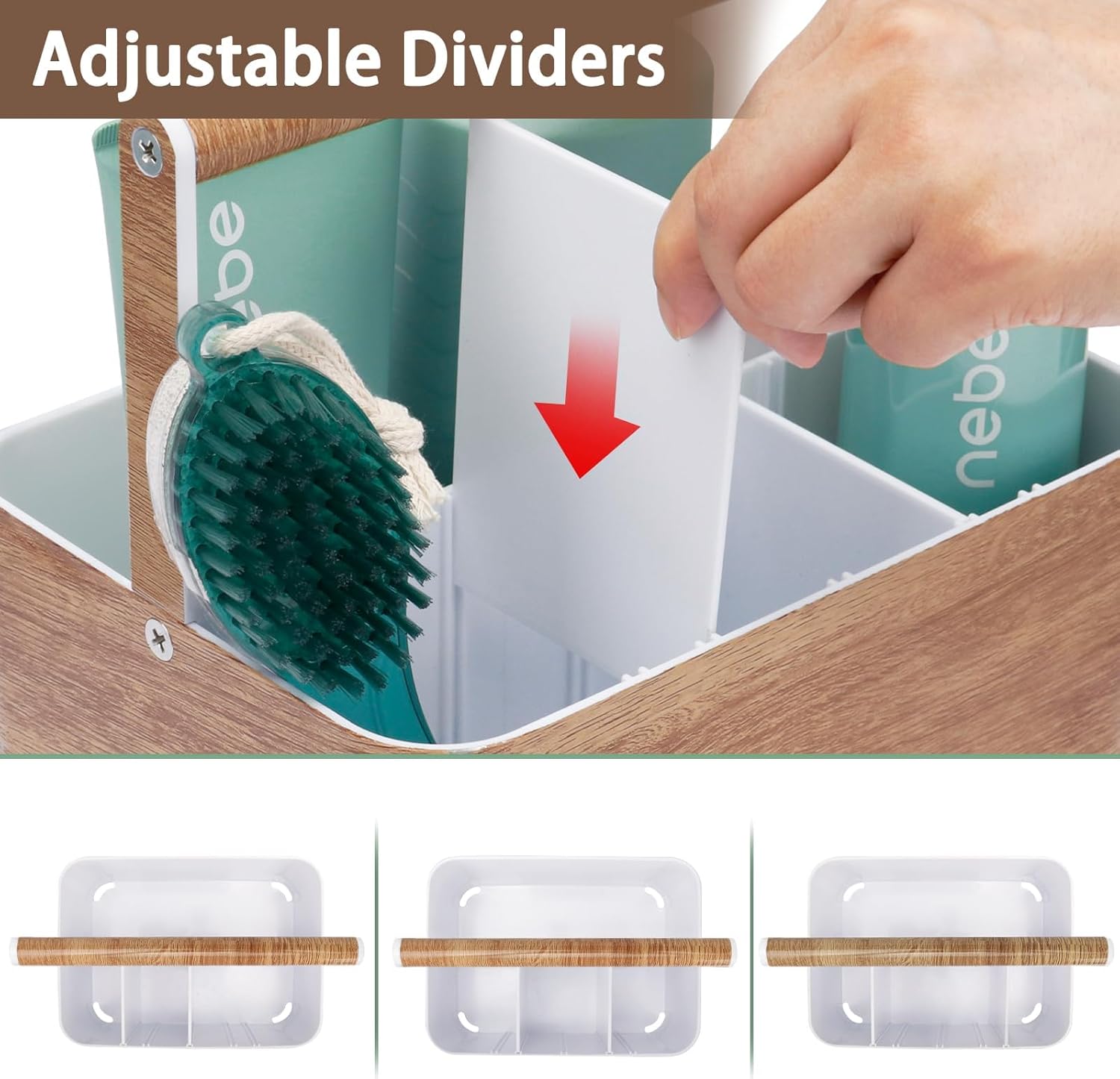 - PERFECT SIZE & ADJUSTABLE DIVIDERS: This plastic shower basket bin have enough capacity to store different kinds of bathroom stuff, like shampoo, conditioner, body wash, body spray, bath bombs, hand lotions, face creams, serums loofahs, scrub brushes, poufs and more. And the dividers of bathroom shower organizer is adjustable. You can create multiple storage compartment (up to 5) according to different needs and preferences. It’s perfect to keep items separated and organized.