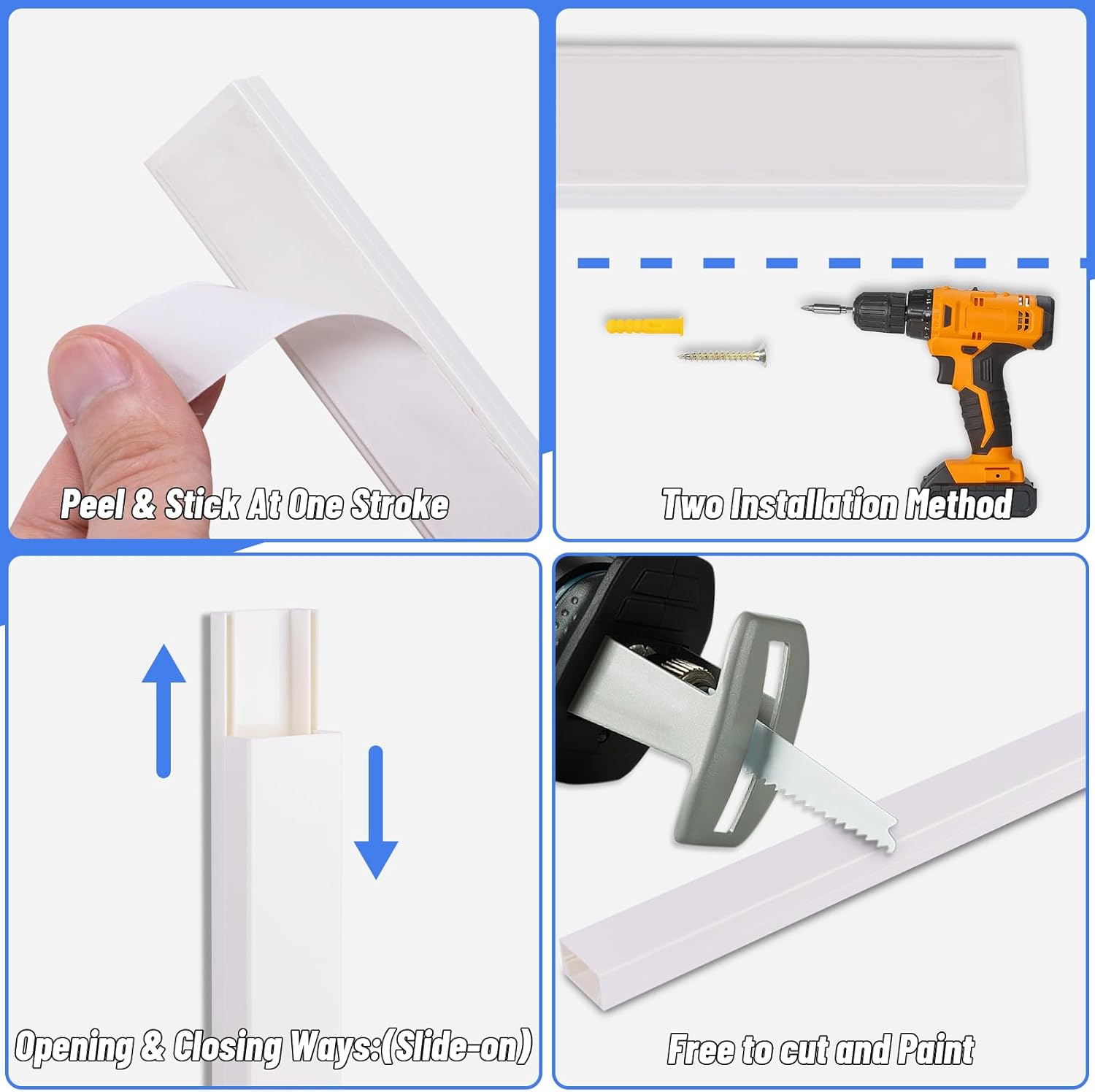 - 40 Pcs White Cable Raceway Kit: Our wire hider kit includes 40×plastic cable concealer channels (each channel is L15.7in×W0.95in×H0.55in, 628 inches total in length), 36×couplings, 24×flat elbows, 8×t-connectors, 4 × Inside elbow, 4 × outside elbow,72×screws, 72×wall anchors, 4×rolls of double-sided tape, 628" cord concealer enough for just about any job