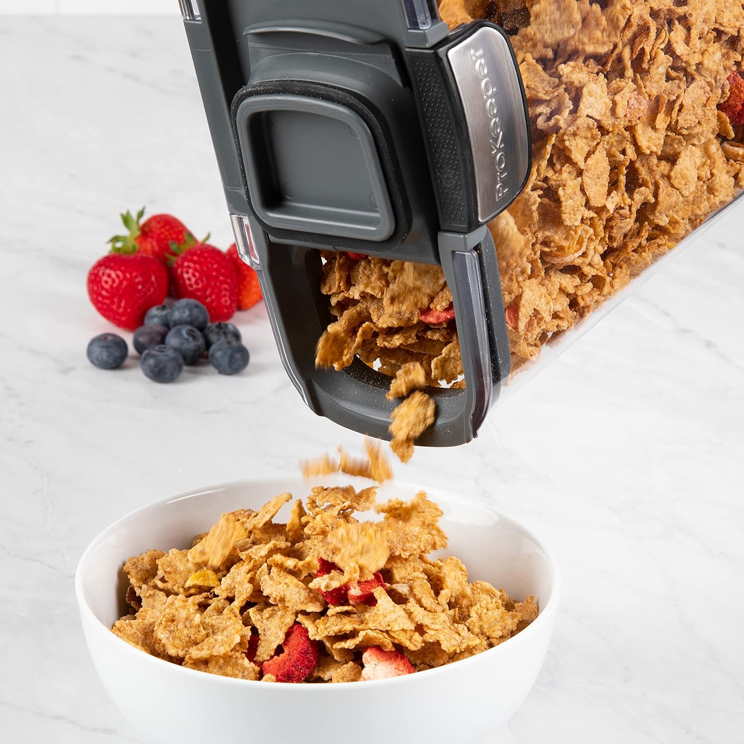- Holds a standard-size cereal box. Wide mouth pour spout is great for pouring all cereal types. Features a silicone seal for airtight storage. Flip & pour spout and contoured body provide ease of use. Measurement markings up to 14 cups indicate the remaining cereal. Dishwasher safe with a 4.2 QT (4.0 L) capacity.