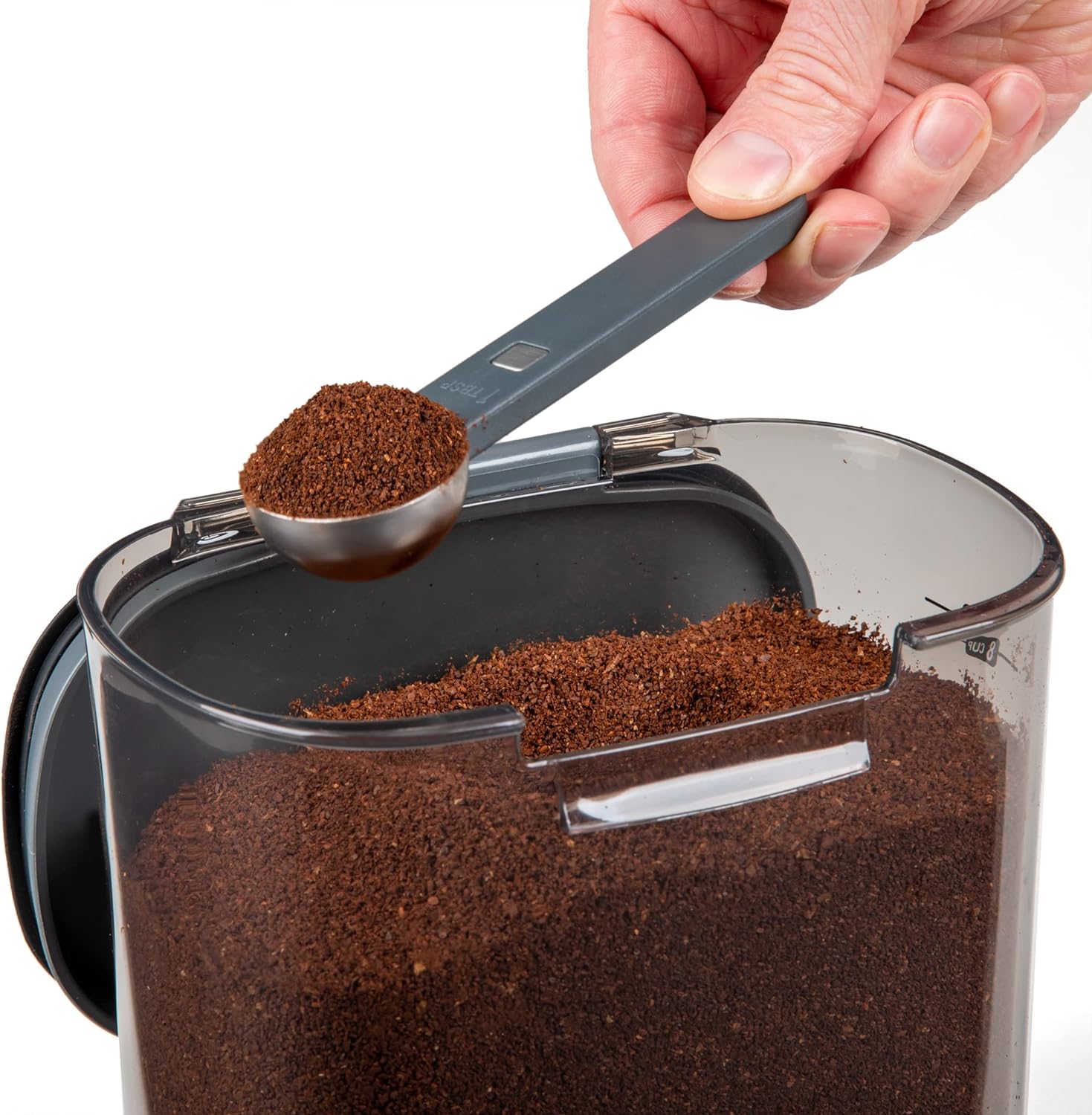 - Keep Your Coffee Fresh with This Premium Canister! It holds 24 oz of ground coffee or 22 oz of whole beans and features a tinted UV-blocking container to preserve flavor. The removable magnetic 1 Tbsp stainless steel scoop stores in the lid, and an airtight silicone seal keeps coffee fresh longer. With measurement markings up to 8 cups, a 2 qt (1.89 L) capacity, and being BPA-free and dishwasher safe, it’s both practical and easy to maintain.