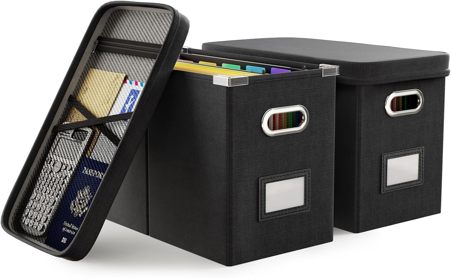 Oterri File Organizer Box with Lid, Hanging Filing File Box with Mesh Pocket, Document Organizer Box for Letter Files, Portable Storage Box with Smooth Sliding Rail for Office&Home (2 PCS, Black)