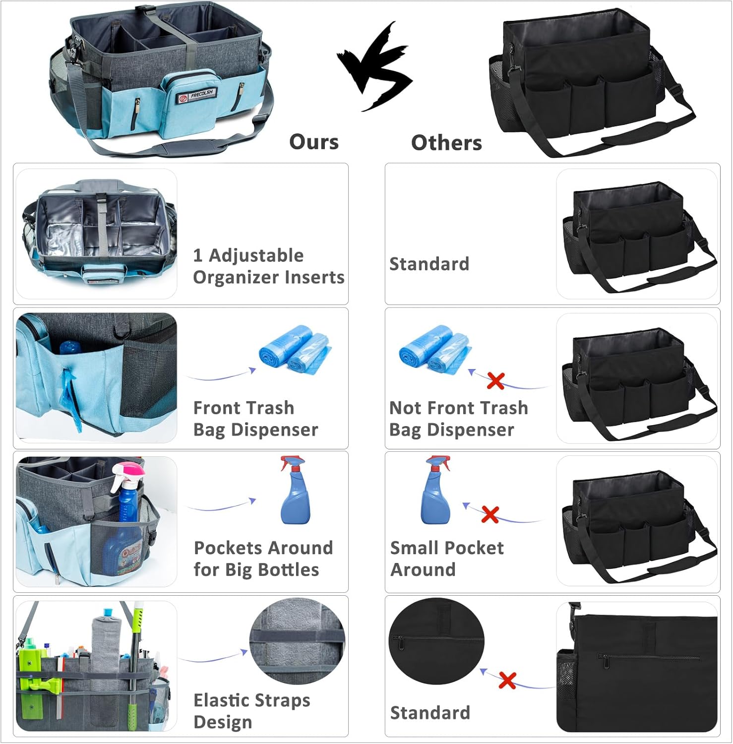 - 【 UPGRADED FEATURES】Upgraded designs including water-resistant thick aluminum bottom, multiple pockets on two sides to keep balance, detachable and adjustable thick inserts, multiple straps to carry it different ways, a keychain hook, zipper pockets and multiple-purpose clips absolutely meet the cleaning worker's needs.