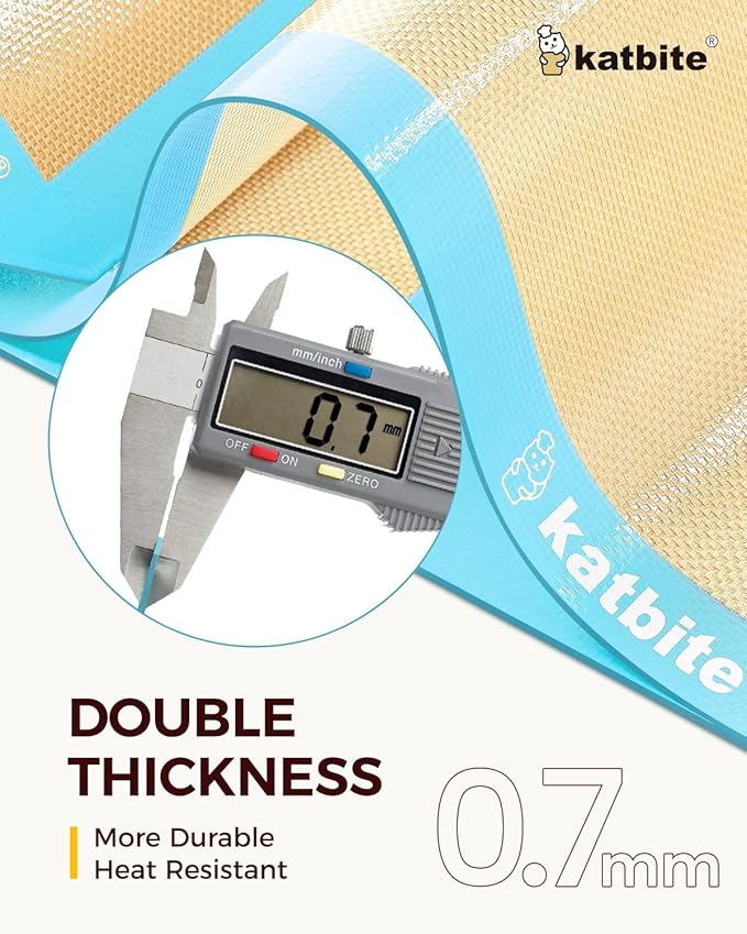 - DOUBLE THICKNESS: Experience culinary confidence with our DOUBLE THICKNESS silicone baking mats. Boasting a substantial 0.7 mm thickness (approx. 1/32"), they outmatch standard mats (0.3 mm) with unparalleled stability and durability. Say goodbye to slipping or wrinkling – our extra thick mats stand strong, ensuring your baking endeavors are flawlessly executed. Elevate your kitchen with quality you can rely on.