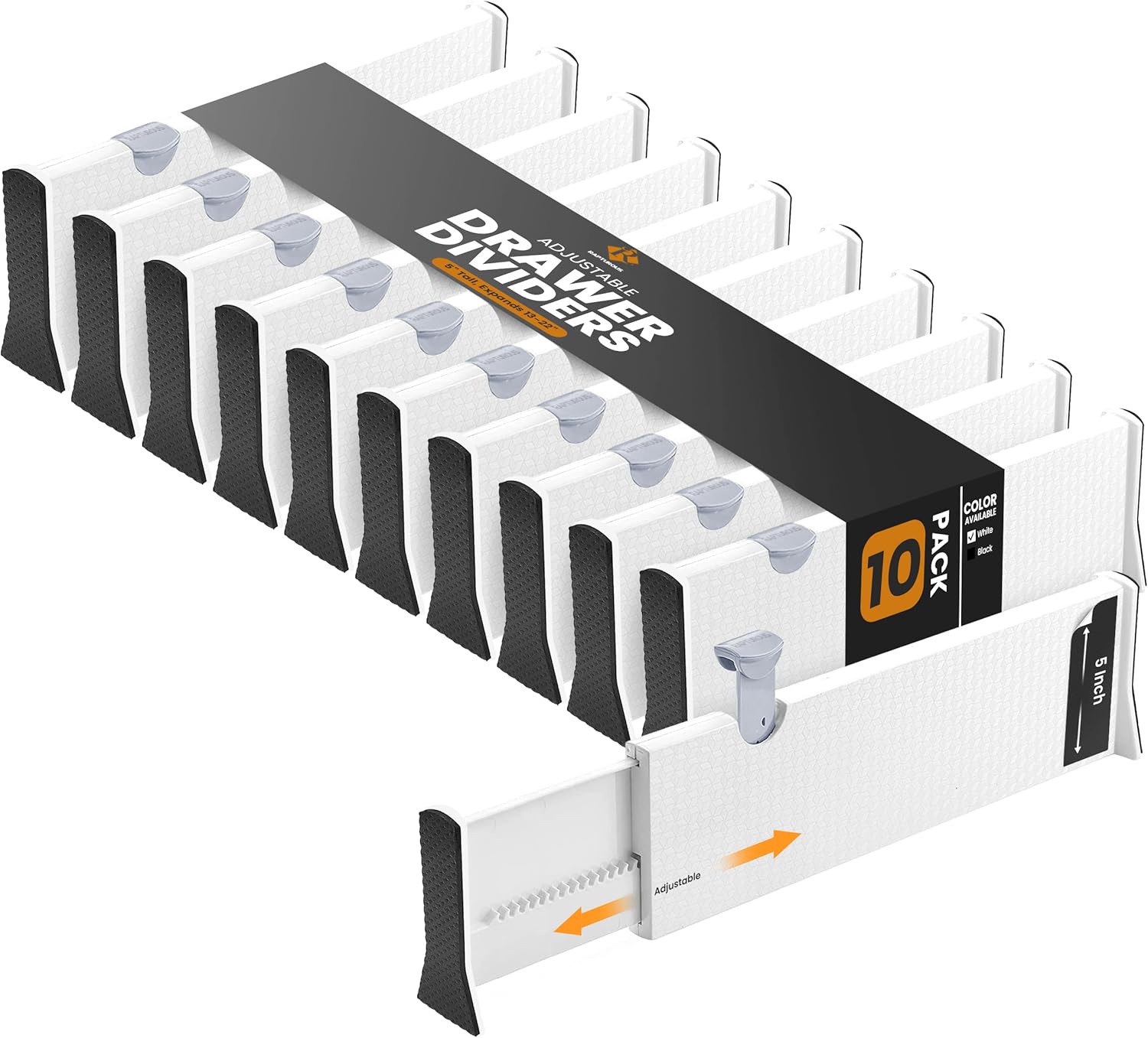 RAPTUROUS Adjustable Deep Drawer Divider – 5" Tall, Expandable 13-22", 10-Pack, Non-Slip Drawer Dividers for Clothes, Dresser, Kitchen & Office Organization (White)