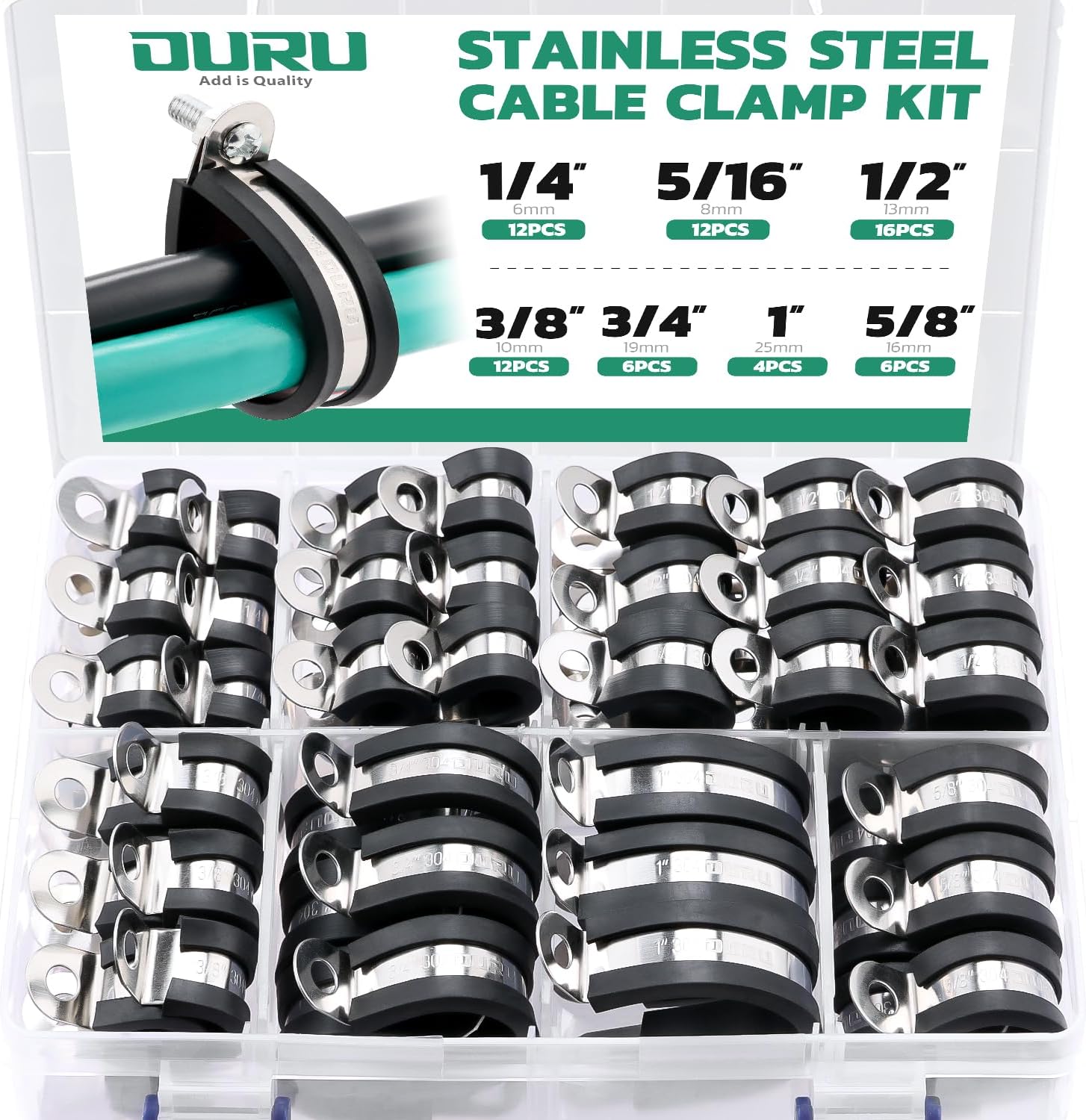 - 68PCS Cable Clamps Assortment Kit —The stainless steel cable clamps assorted box including 7 different sizes,12pcs 1/4’’(6mm),12pcs 5/16’’(8mm),16pcs 1/2’’(13mm),12pcs 3/8’’(10mm),6pcs 3/4’’(19mm),4pcs 1’’(25mm),6pcs 5/8’’(16mm),various sizes are available to meet your needs
