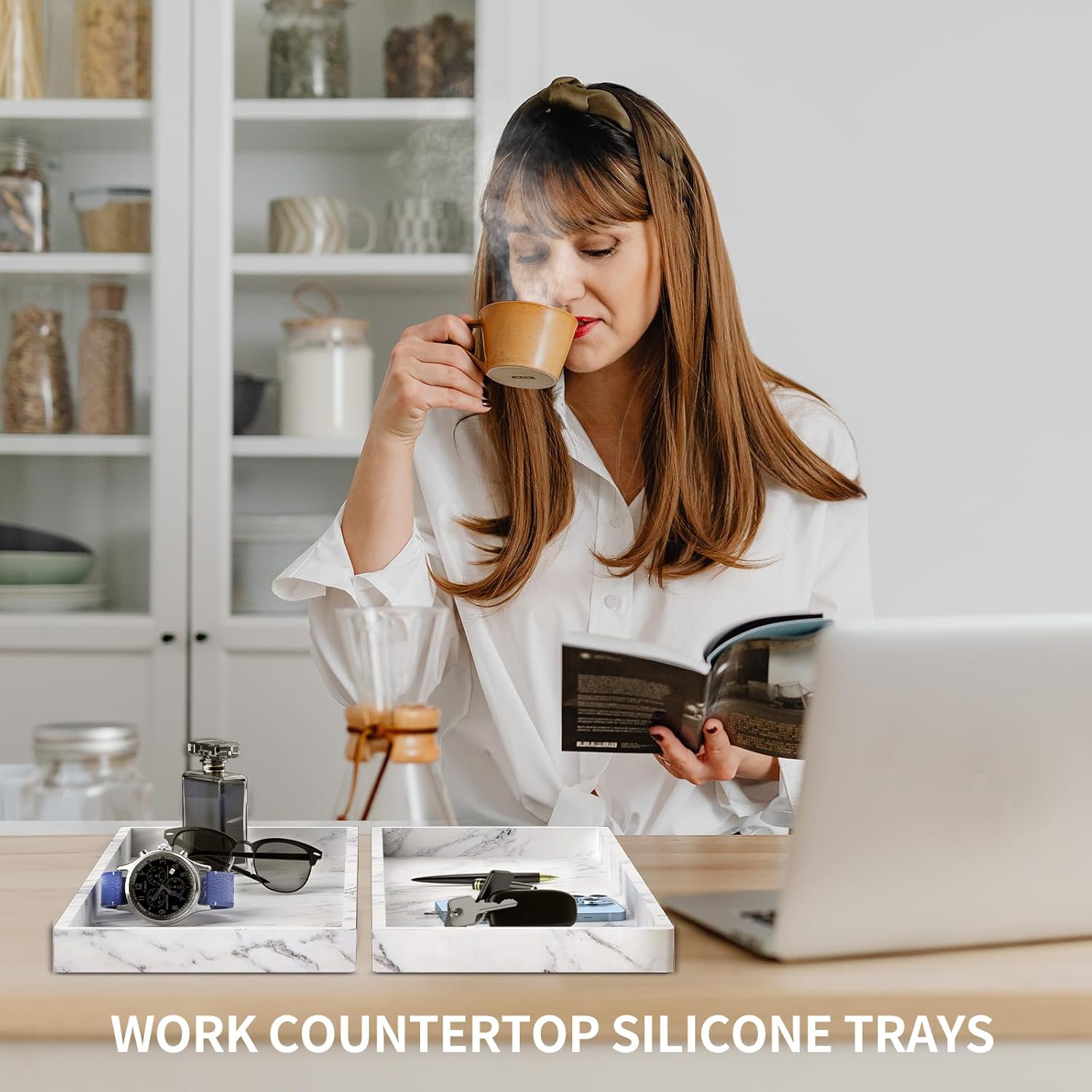BBK Bathroom Vanity Tray 11.8 in- 2 Pack(Large) Silicone Bathroom Tray for Counter, Perfume Key Trinket Ring Tray, Decor Soap Dispenser Countertop Tray for Kitchen Sink Organization(Faux Marble Look)