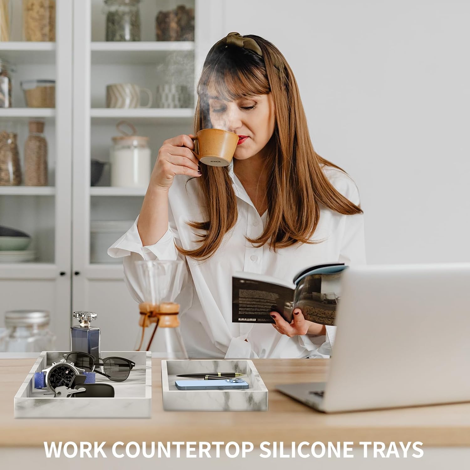 BBK Bathroom Vanity Tray - 2 Pack (7.8" and 11.8") Silicone Bathroom Trays for Counter, Perfume Key Trinket Ring Tray, Decor Soap Dispenser Countertop Tray for Kitchen Sink Organization (Marble Gray)