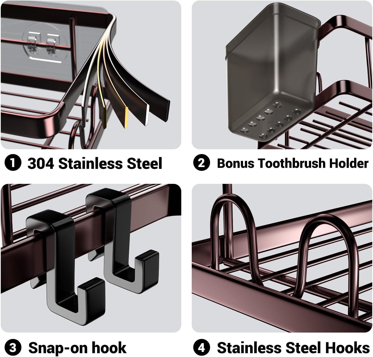 - [Premium Material & Package Contents]: Corner shower organizer is made of stainless steel, coated with rustproof paint and the solid frame wire is much more thickened than old version shower caddies. Package included: 2 x corner shower caddy, 4 x adhesive, 4 x plastic hook, 2 x toothpaste holder.