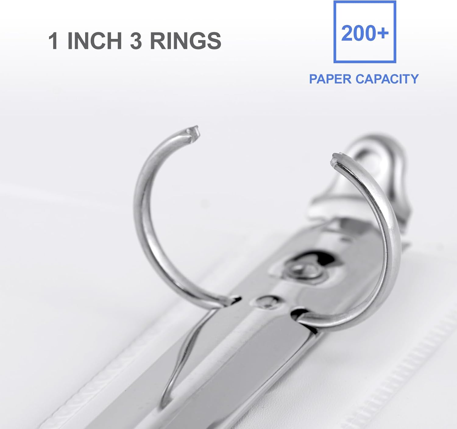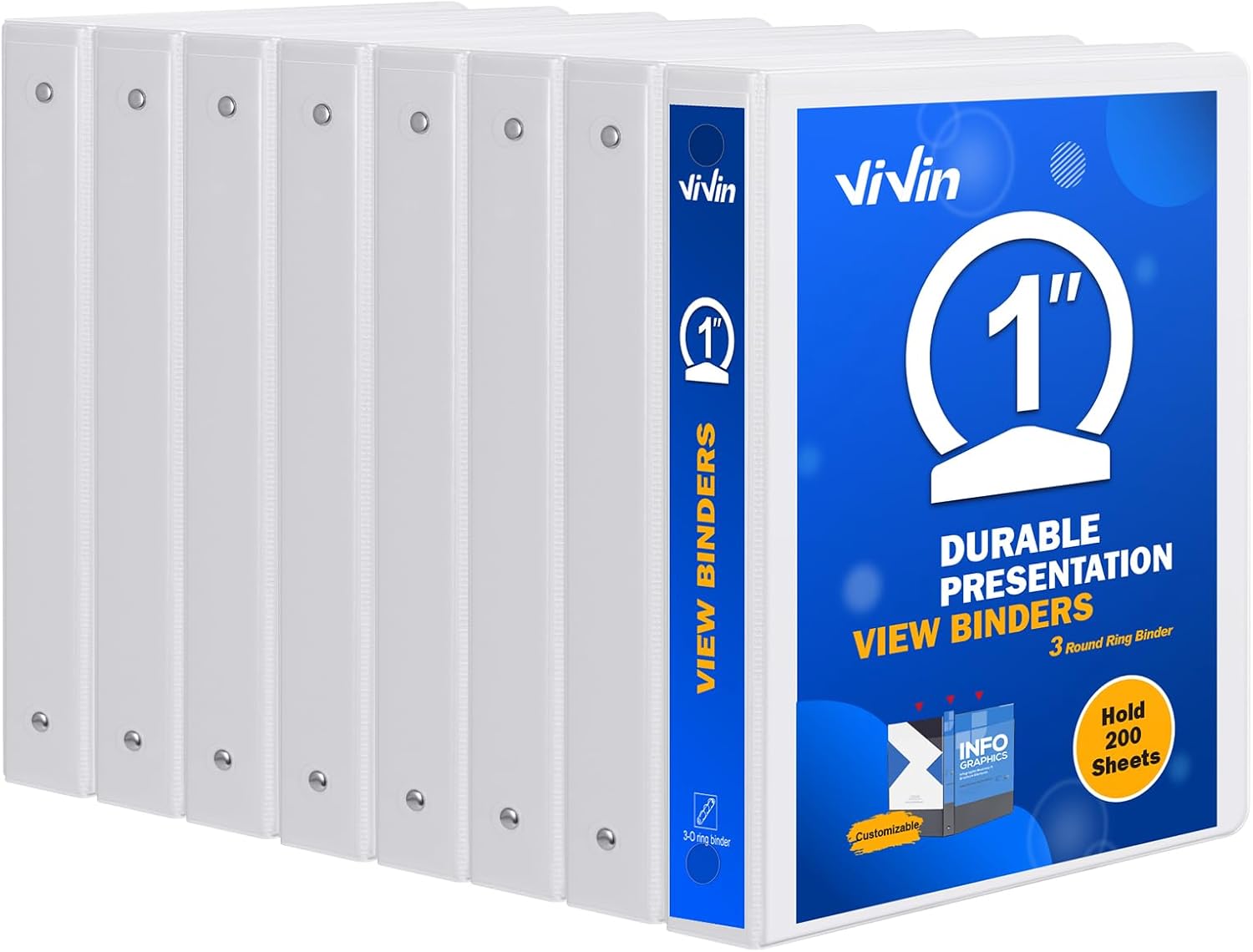 3 Ring Binder 1 Inch, ViVin Sturdy 1"-Round Ring Binder with 2 Interior Pockets, Clear View Cover, PVC-Free, Fits 200 Sheets of 8.5'' x 11'' Paper, Office Home School (8 Pack, White)