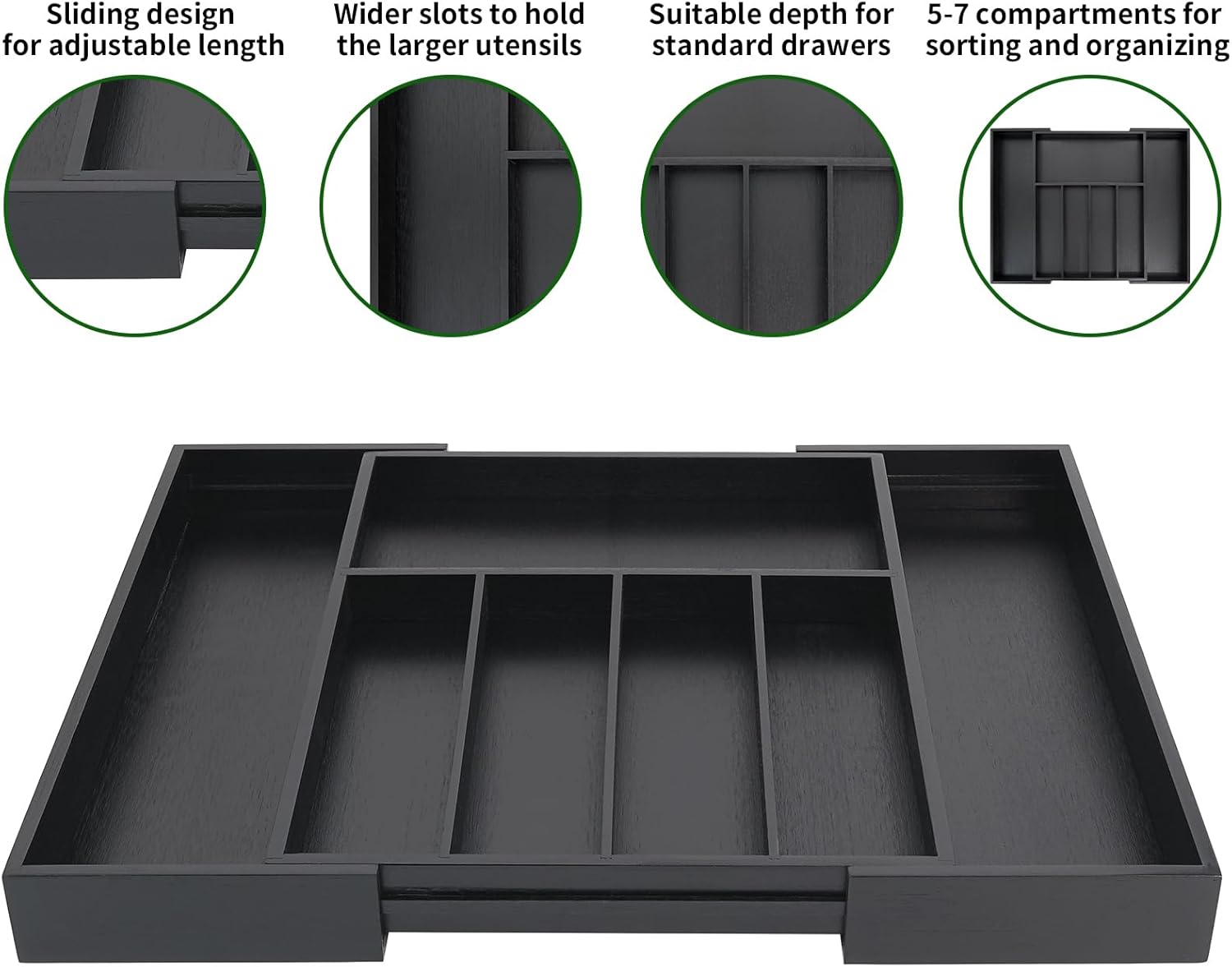 VaeFae Premium Bamboo Drawer Organizer, Expandable Silverware Drawer Organizer, Cutlery Tray with Dividers for Kitchen Utensils (Black, Large)