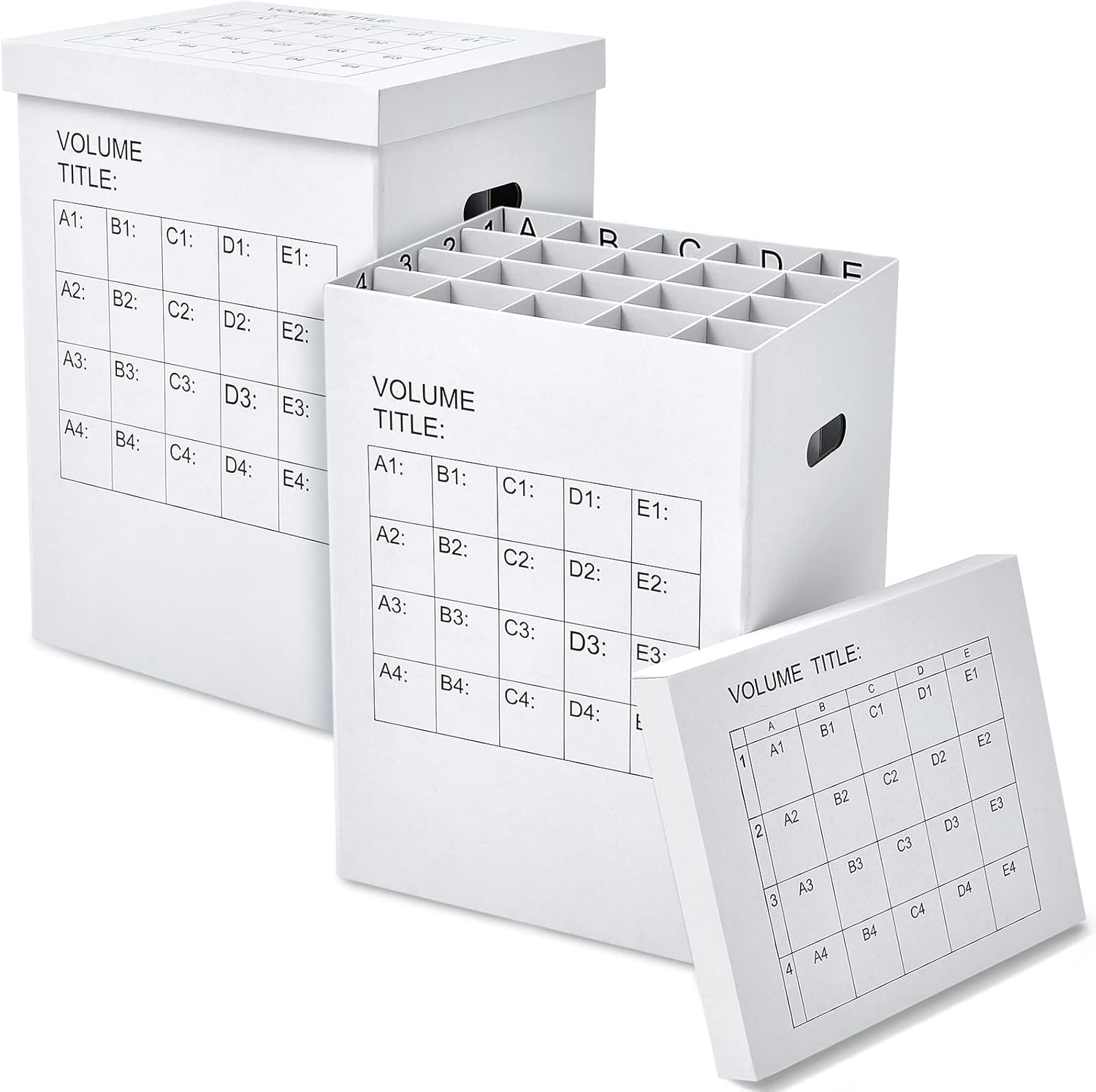 - 40 Slots : you will get 2 cardboard file boxes with lids, each measuring about 17.7 x 14.2 x 25 inches, each box is designed 4 x 5 with 20 slots , each Slot is approx. 3.54 x 3.54 inches, and can store items up to 25 inches high