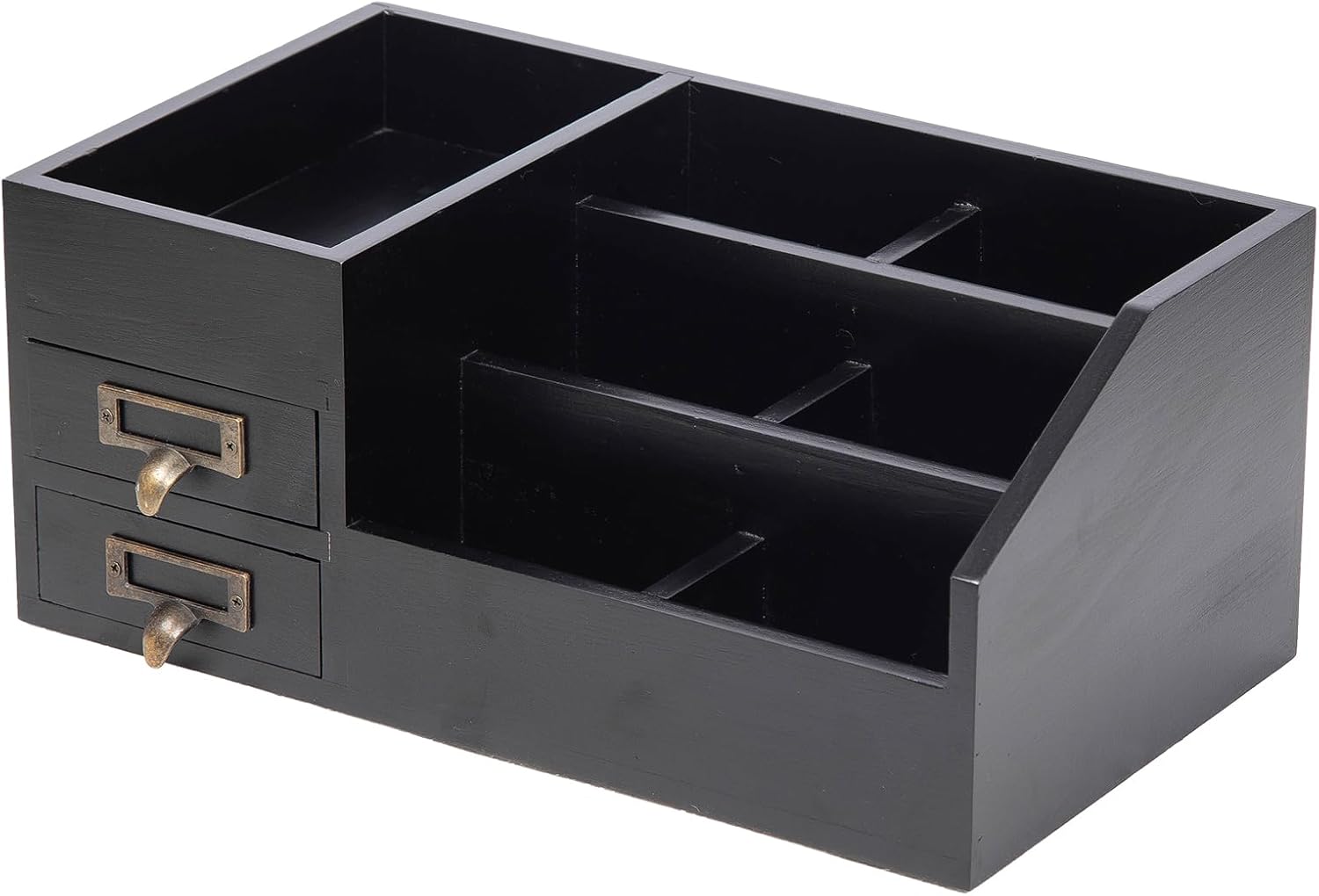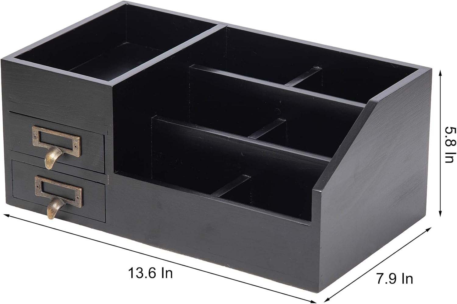 Distressed Rustic Wooden Office Desktop Organizer Wood Shelf Tabletop Home Organizer Storage with Multiple Compartments 2 Tier Drawers,perfect Jewelry storage Display Box for Desk, Vanity (Black)