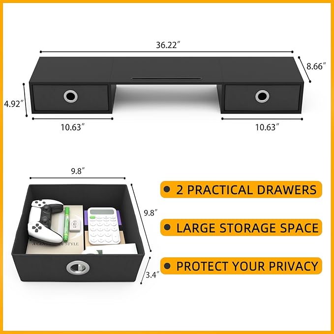 - 【Monitor Stand with 2 Drawers】Our computer monitor riser includes practicality slide-out drawers, for storing items like post-it notes, writing utensils and mobile devices.