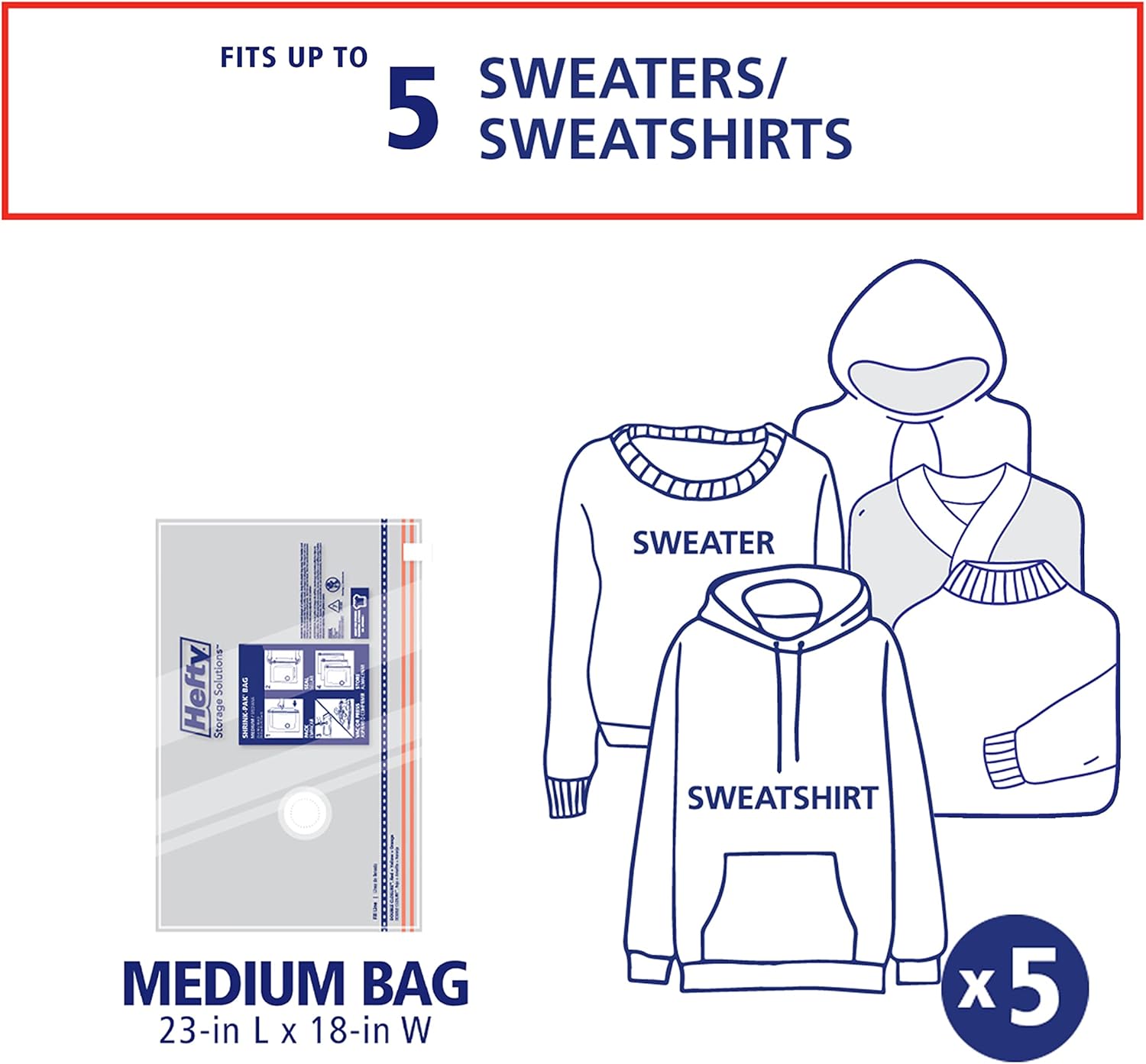 - 6 Medium Bags: Each Medium bag is perfect for storing 5 sweaters or sweatshirts