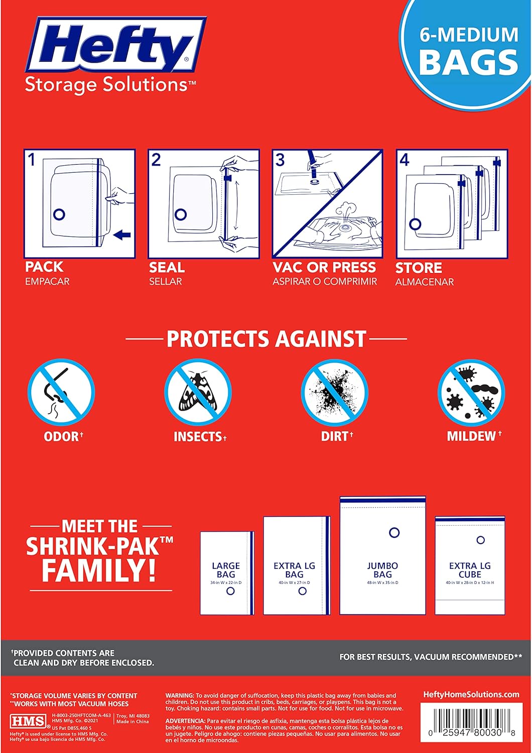 - Space Saving Storage Solution: Hefty SHRINK-PAK vacuum storage bags are the perfect storage solution for seasonal clothing and bedding, offering maximum shrinkage and effectively saving space in your closet, suitcase or under your bed